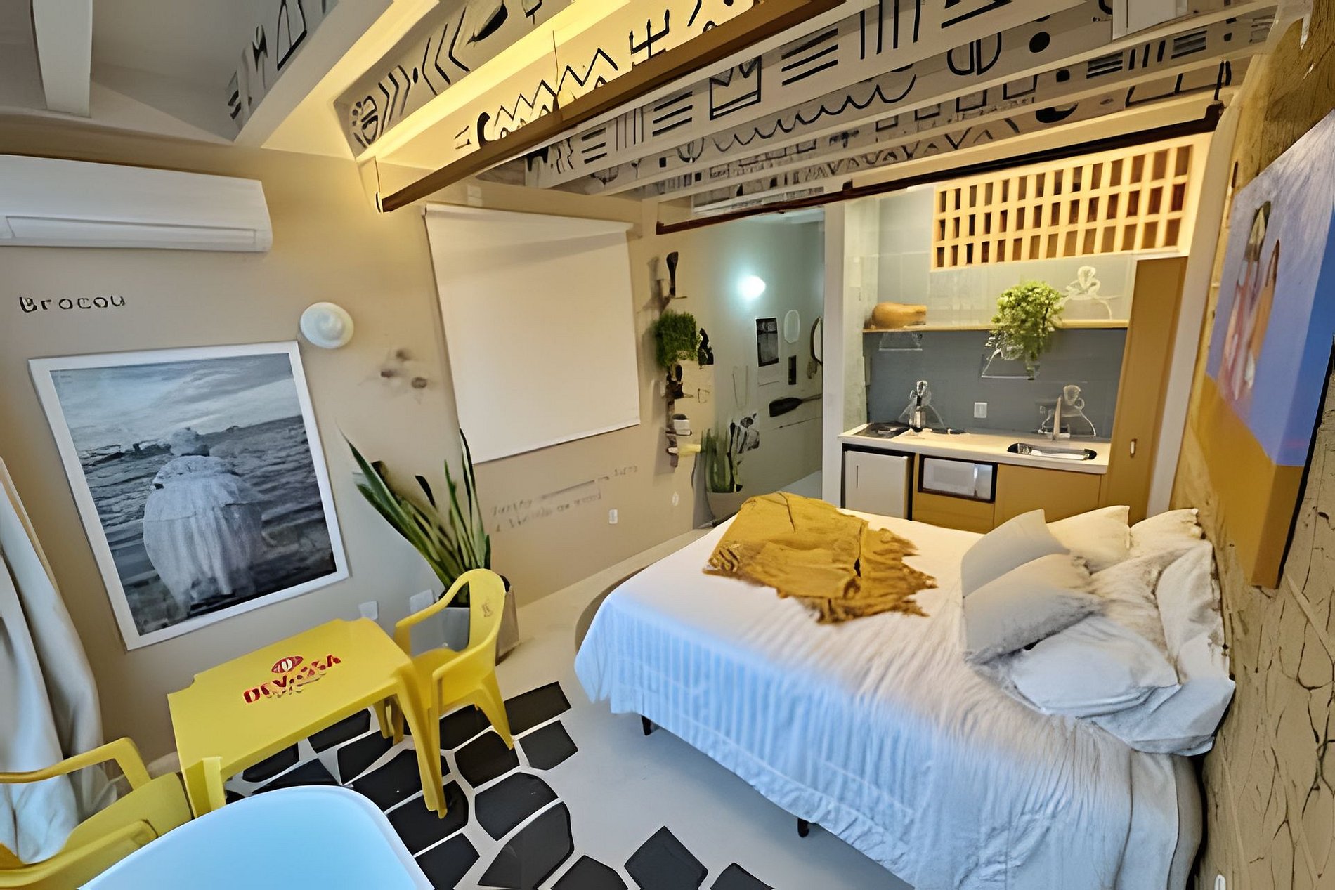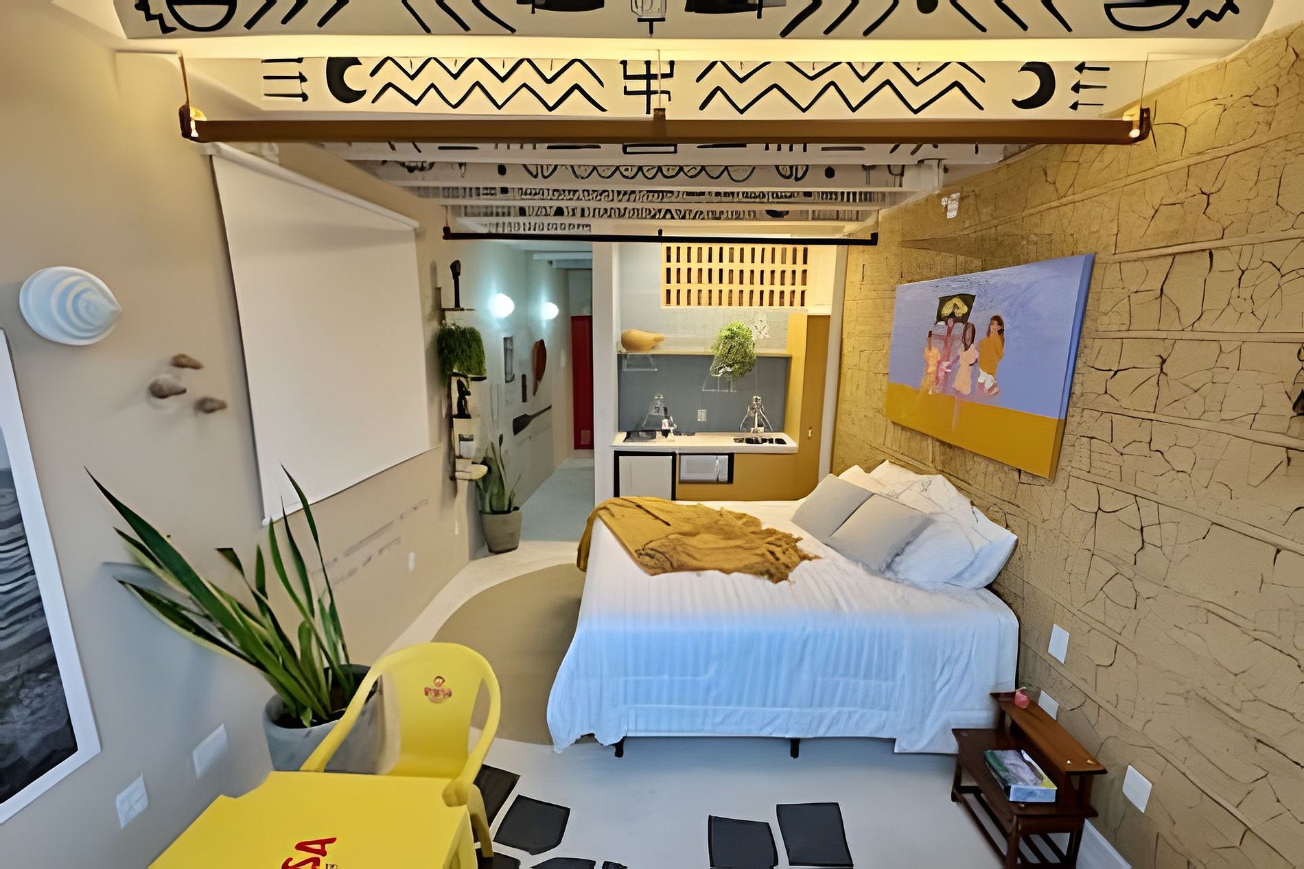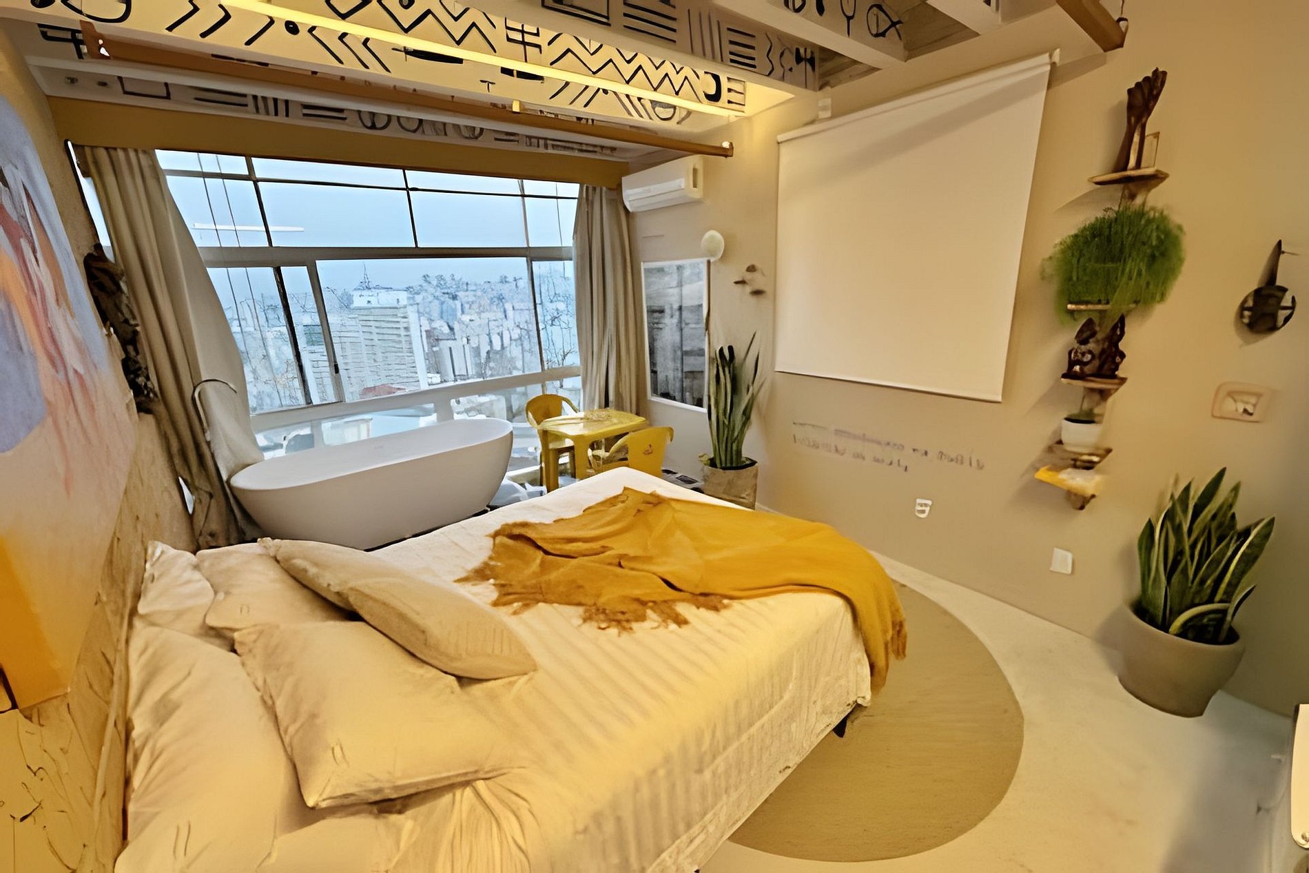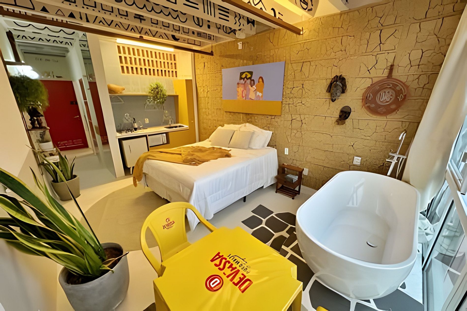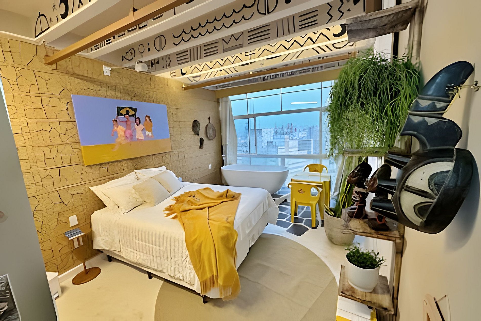 Inspirado no Axé de Salvador, esse projeto traz para o 26º andar do Edifício Copan um desenho que remete a variados aspectos da vida cotidiana soteropolitana. O apartamento tem banheira com vista para a cidade e um telão de 100" Samsung Freestyle