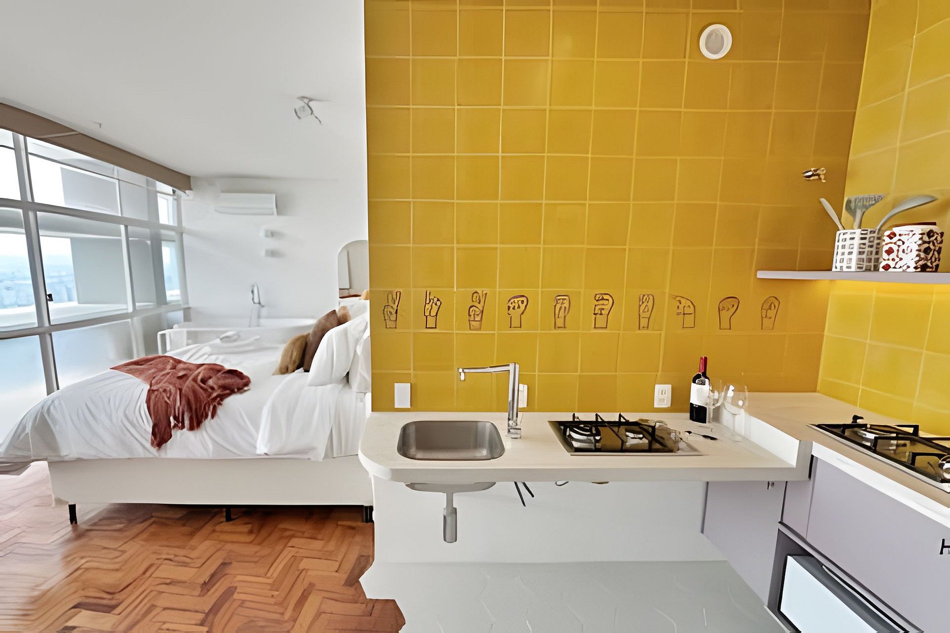 Estamos muito felizes de desenvolver nosso primeiro studio Acessível no Copan. Passagens de 90cm sem limitadores ou diferenças de nível no piso; Bancadas de cozinha e banheiro de 76 e 92cm; Barras de apoio; box com abertura ampla e sem diferença de nível; Livros em braile; arte sensorial.