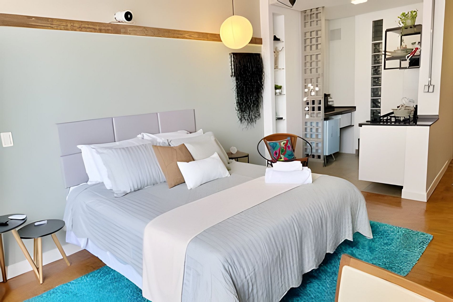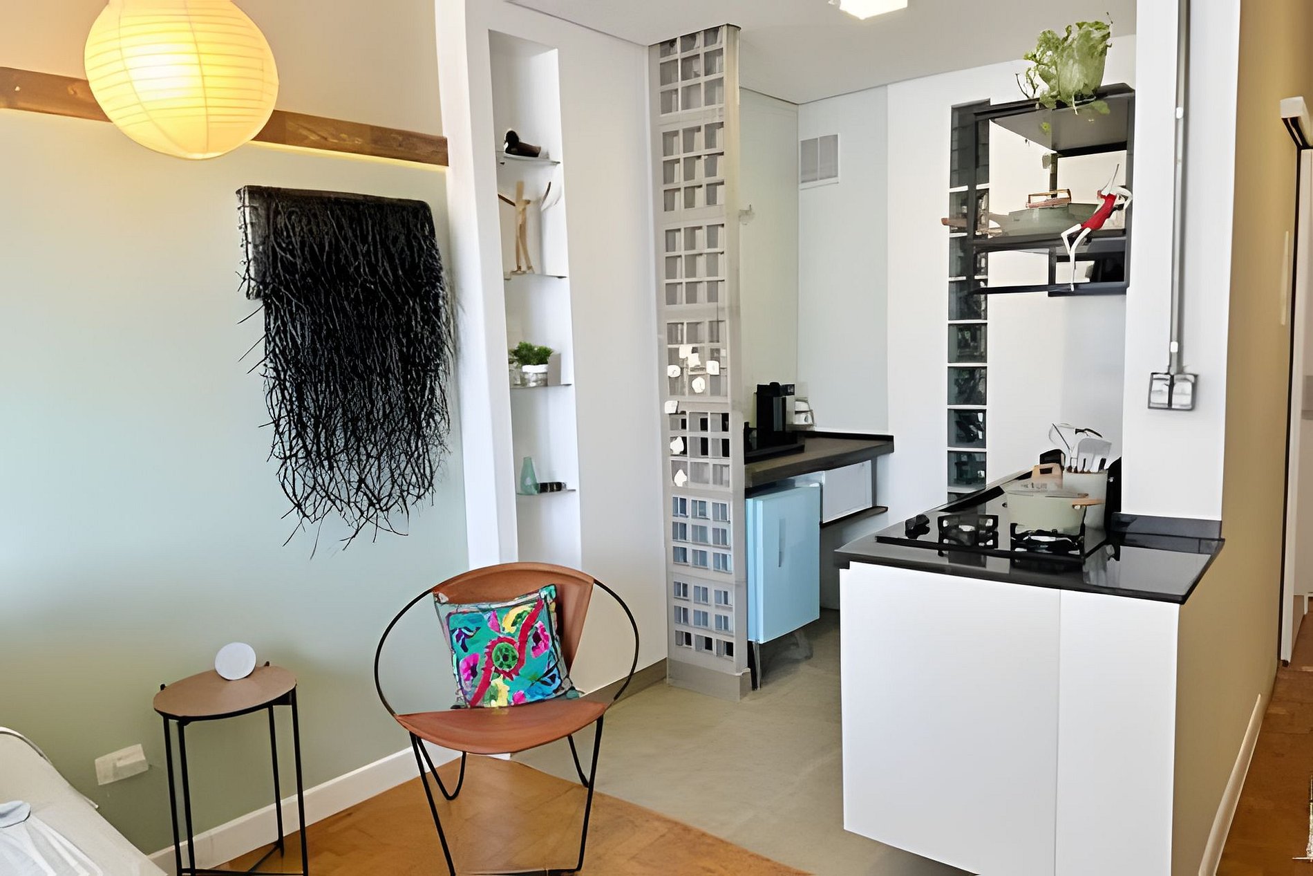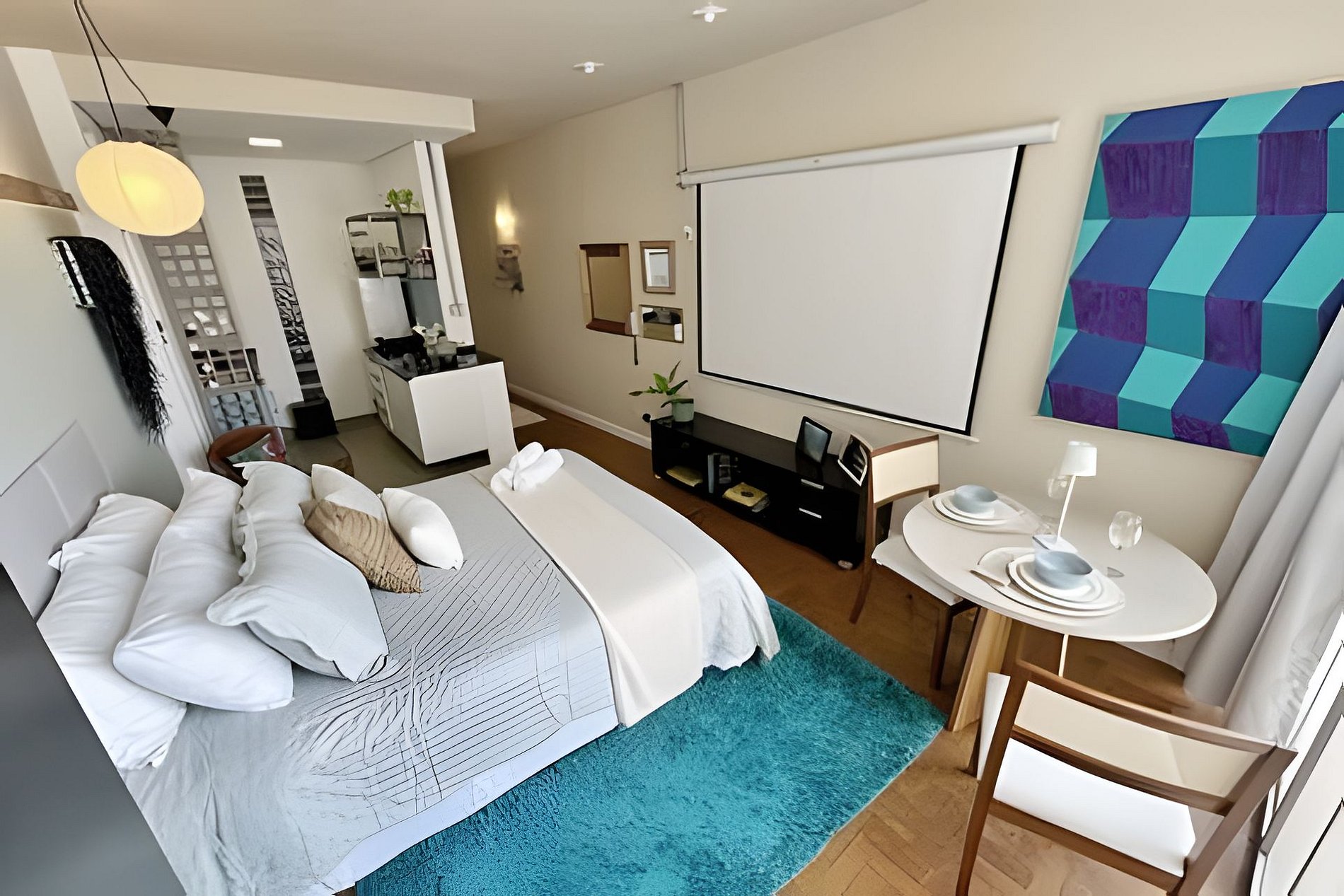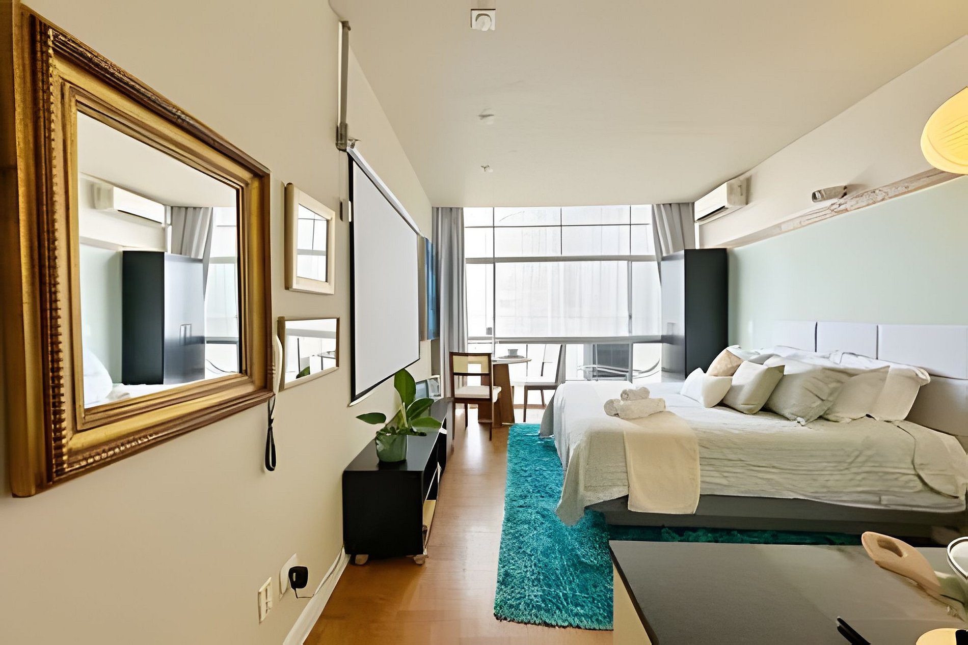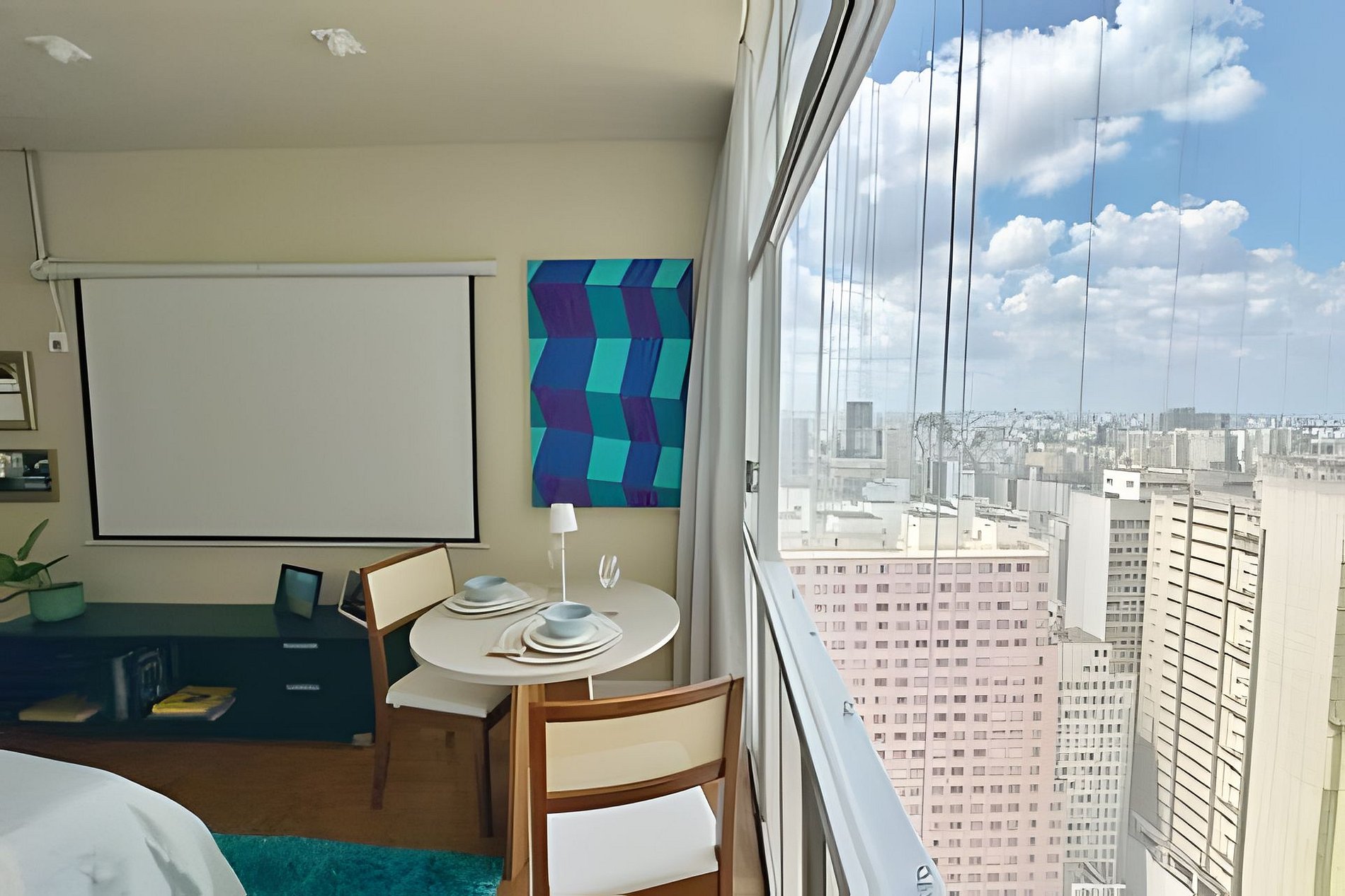 Studio no 28º andar do Edifício Copan com ar condicionado, telão de 100 polegadas e cozinha completa. Cama queen size e mesa de jantar para duas pessoas. A proprietária, que é artista plática e designer de interiores, decorou este apartamento com algumas de suas obras, trazendo grande pessoalidade ao ambiente. Hospede-se em um dos último andares do edifício Copan com todo o conforto necessário para uma estadia longa ou curta.
