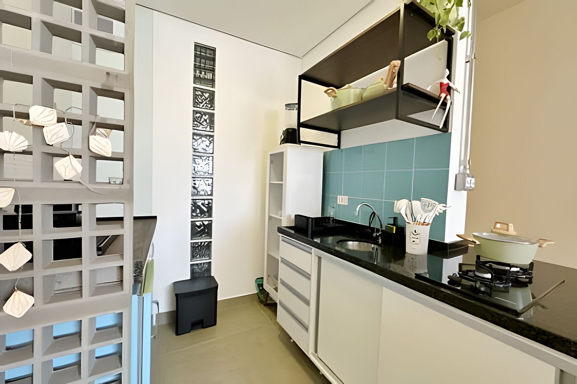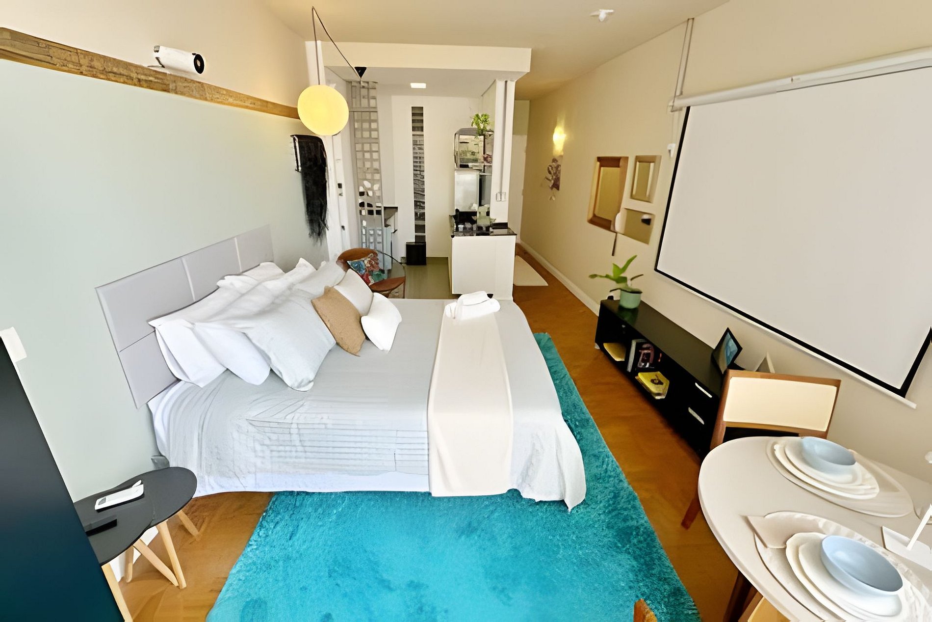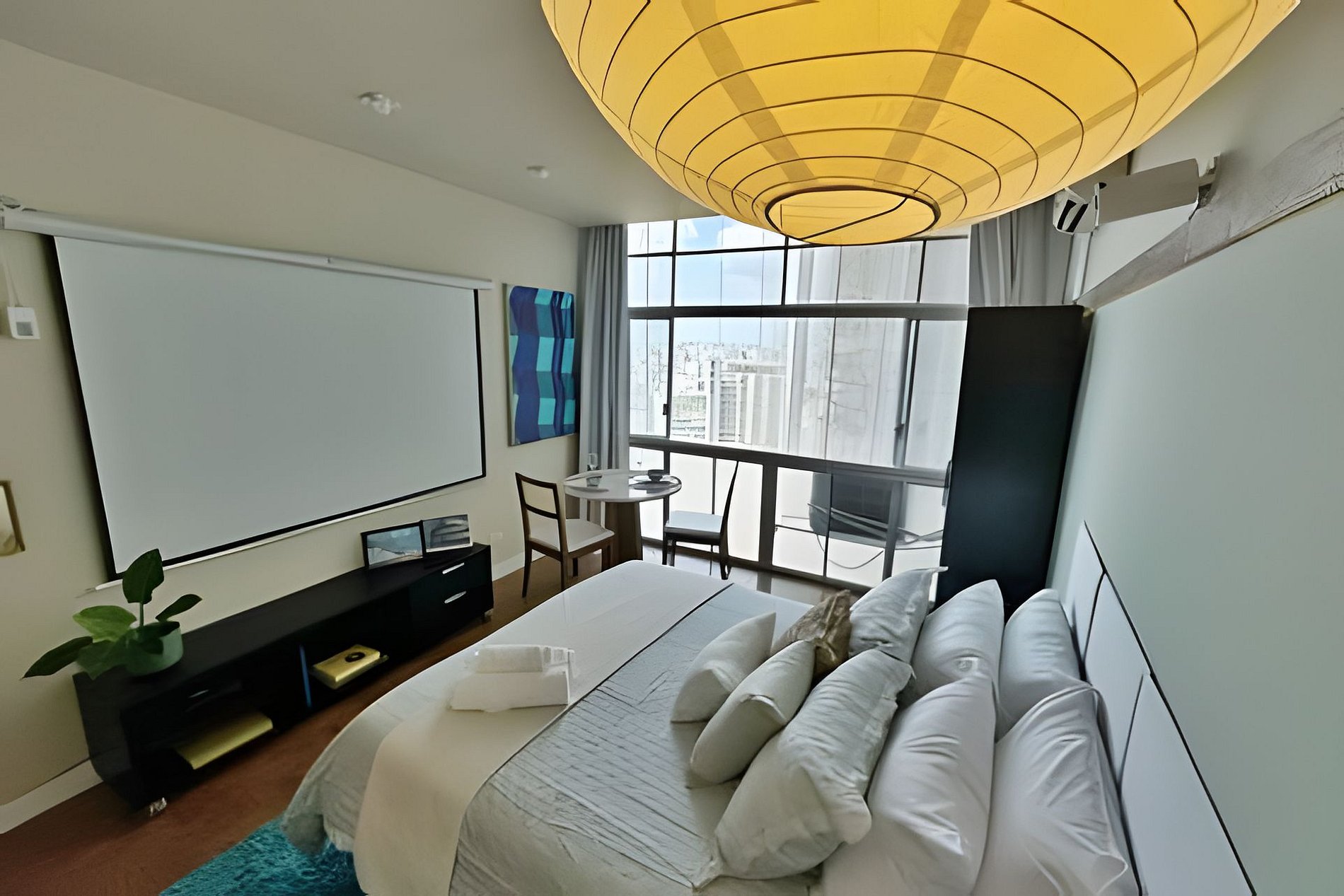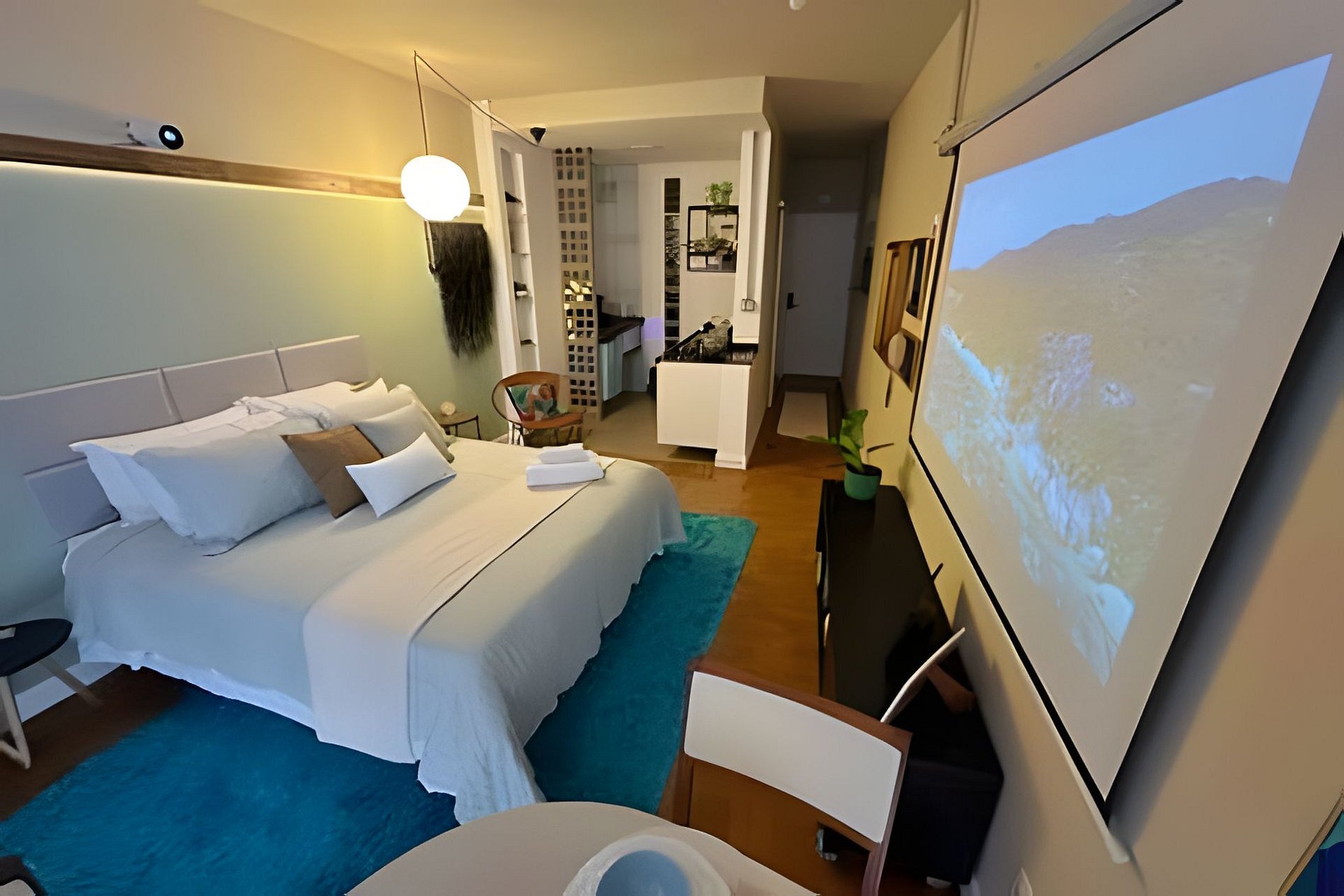 Studio no 28º andar do Edifício Copan com ar condicionado, telão de 100 polegadas e cozinha completa. Cama queen size e mesa de jantar para duas pessoas. A proprietária, que é artista plática e designer de interiores, decorou este apartamento com algumas de suas obras, trazendo grande pessoalidade ao ambiente. Hospede-se em um dos último andares do edifício Copan com todo o conforto necessário para uma estadia longa ou curta.