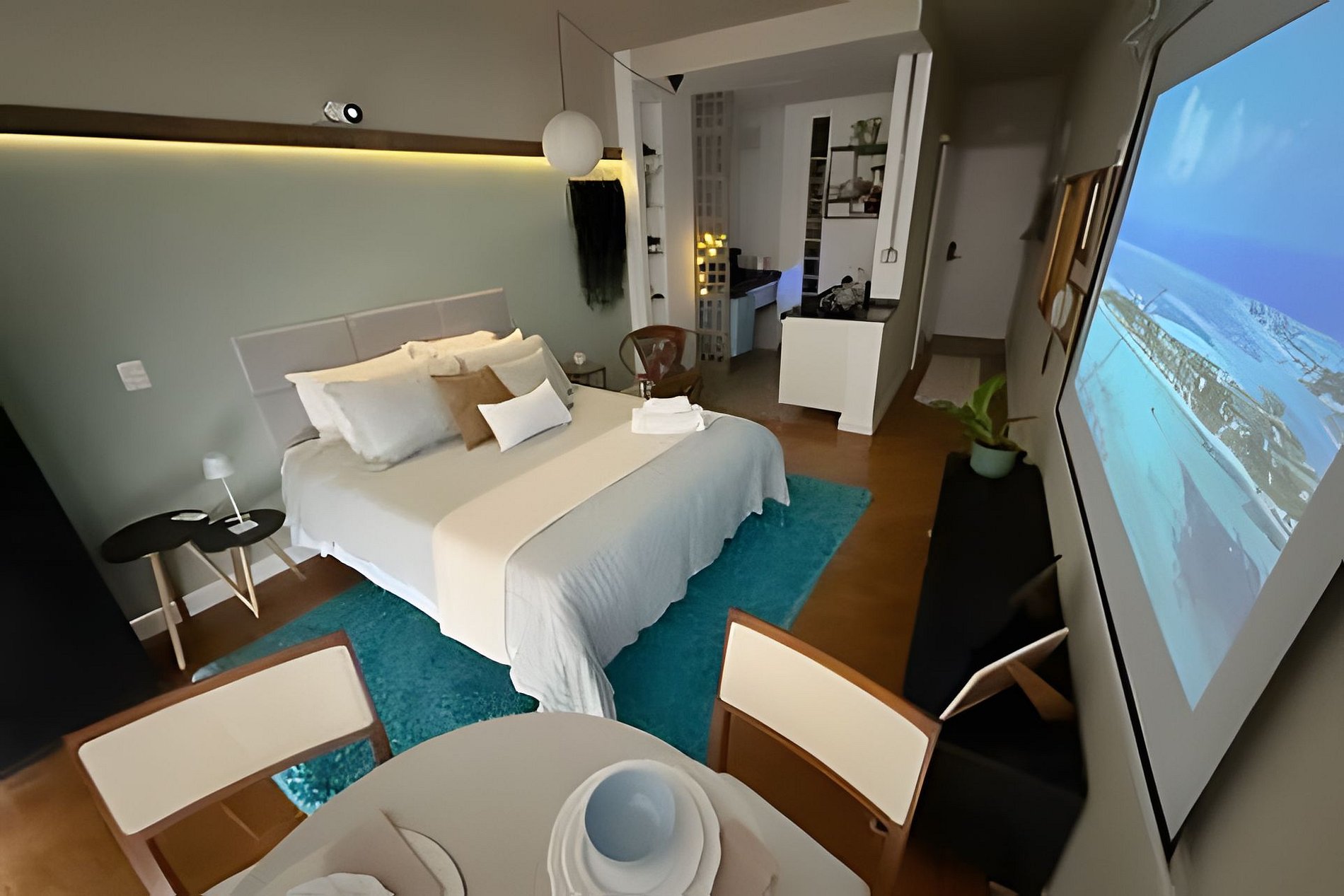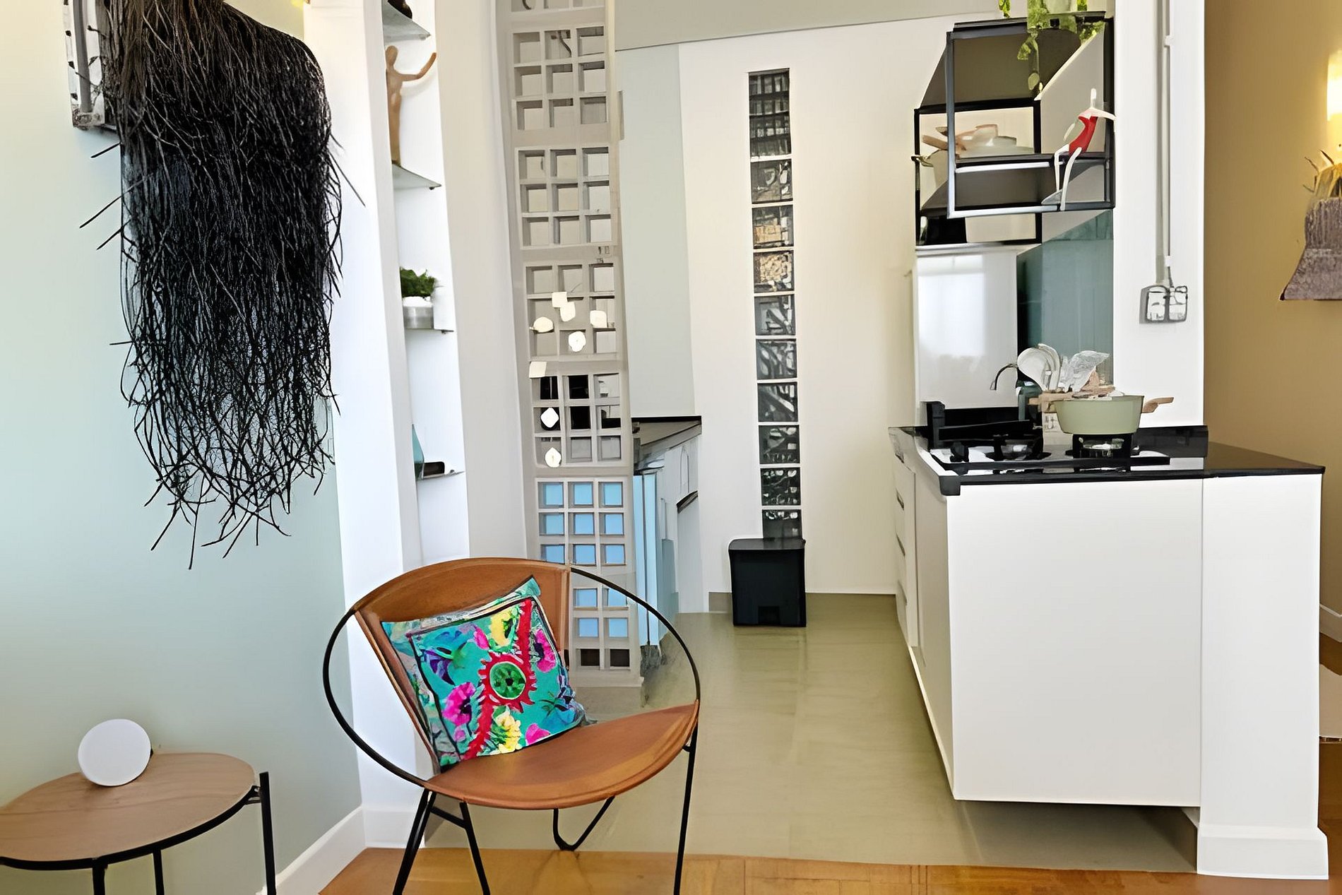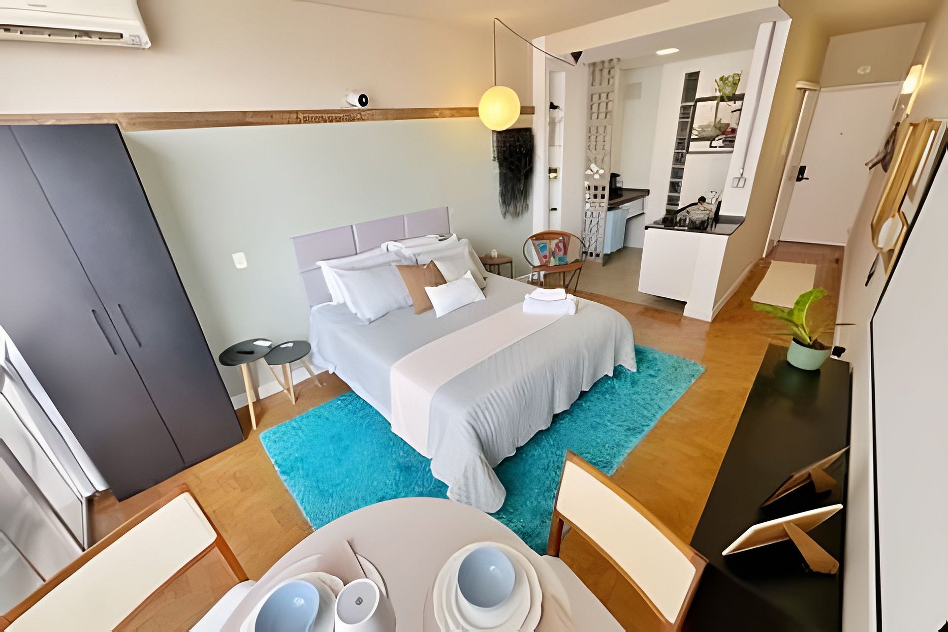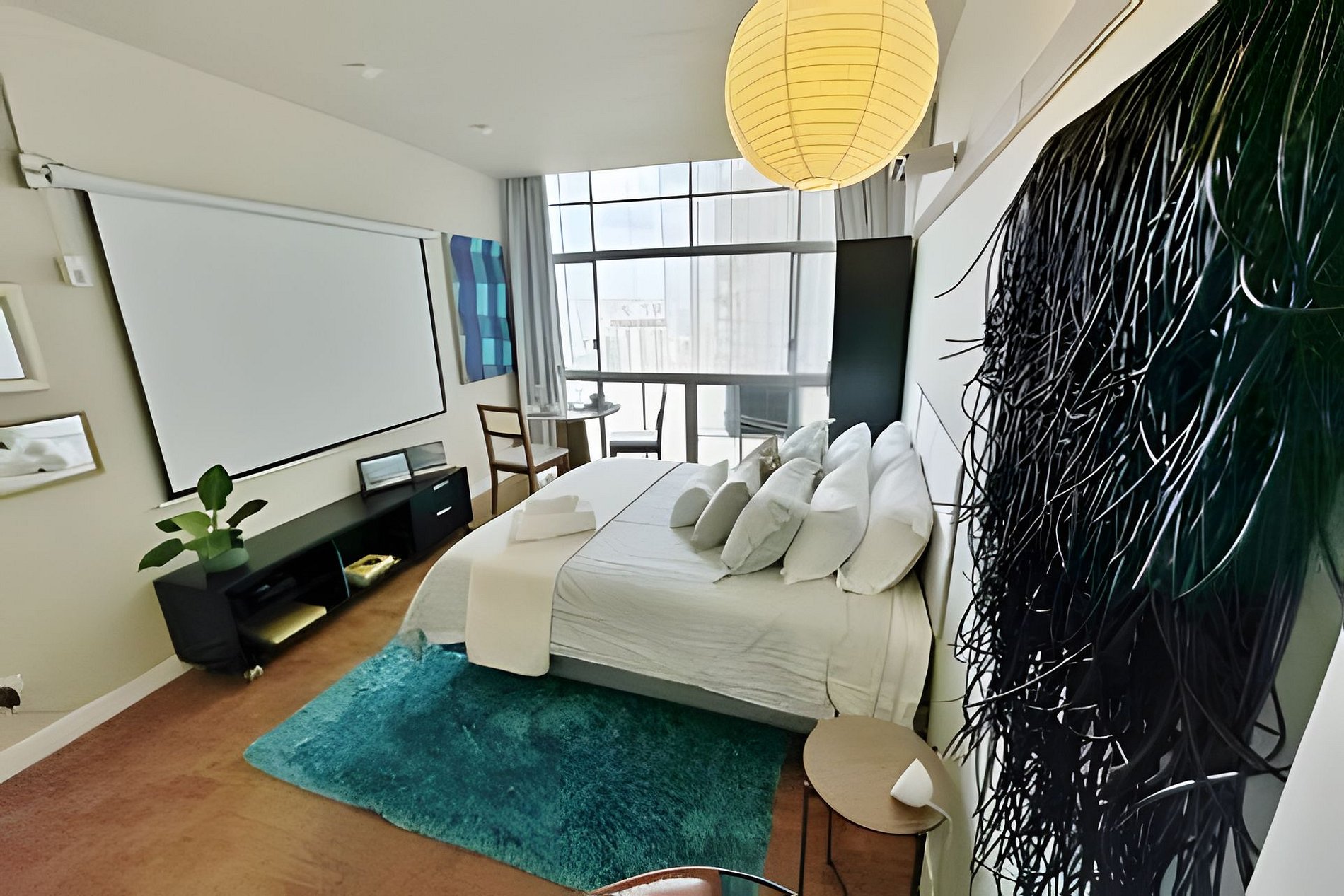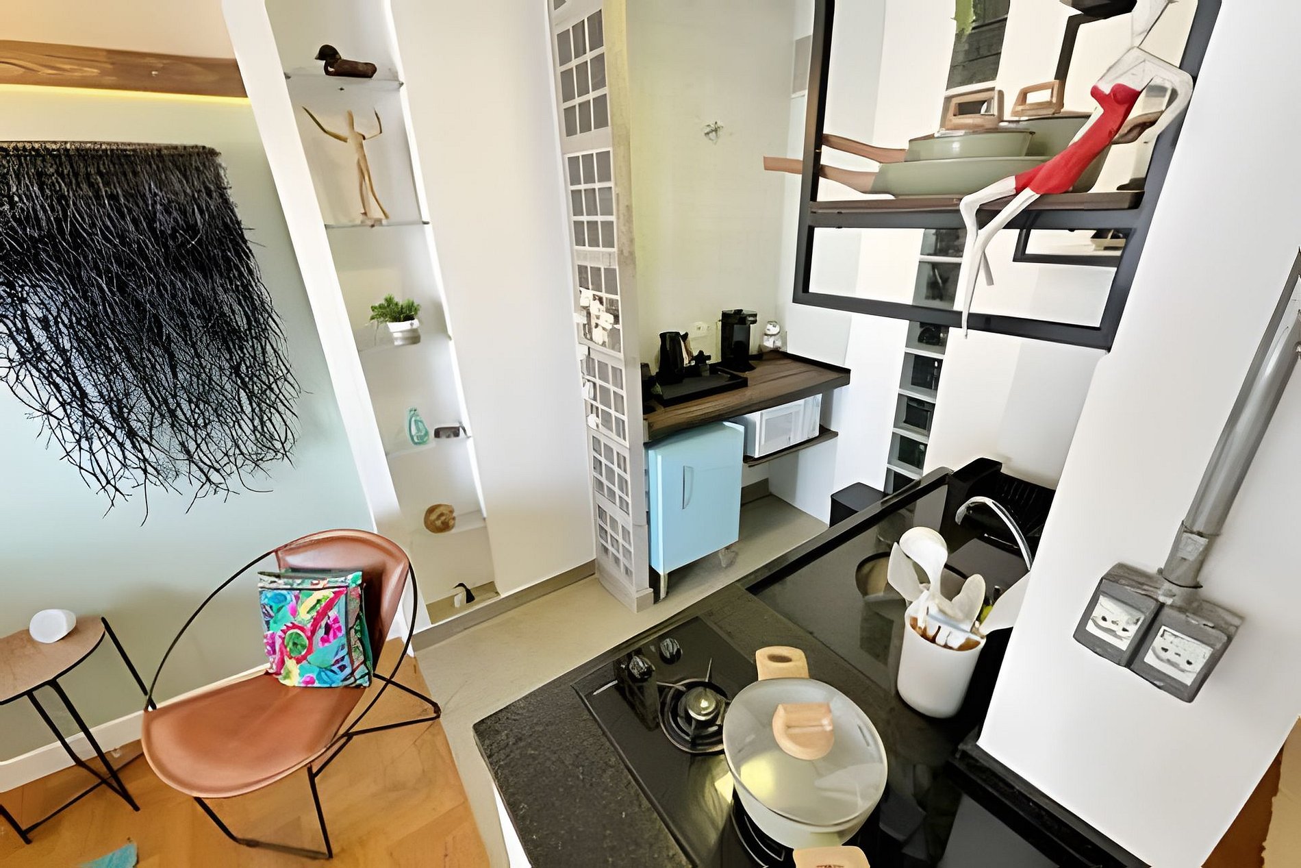 Studio no 28º andar do Edifício Copan com ar condicionado, telão de 100 polegadas e cozinha completa. Cama queen size e mesa de jantar para duas pessoas. A proprietária, que é artista plática e designer de interiores, decorou este apartamento com algumas de suas obras, trazendo grande pessoalidade ao ambiente. Hospede-se em um dos último andares do edifício Copan com todo o conforto necessário para uma estadia longa ou curta.