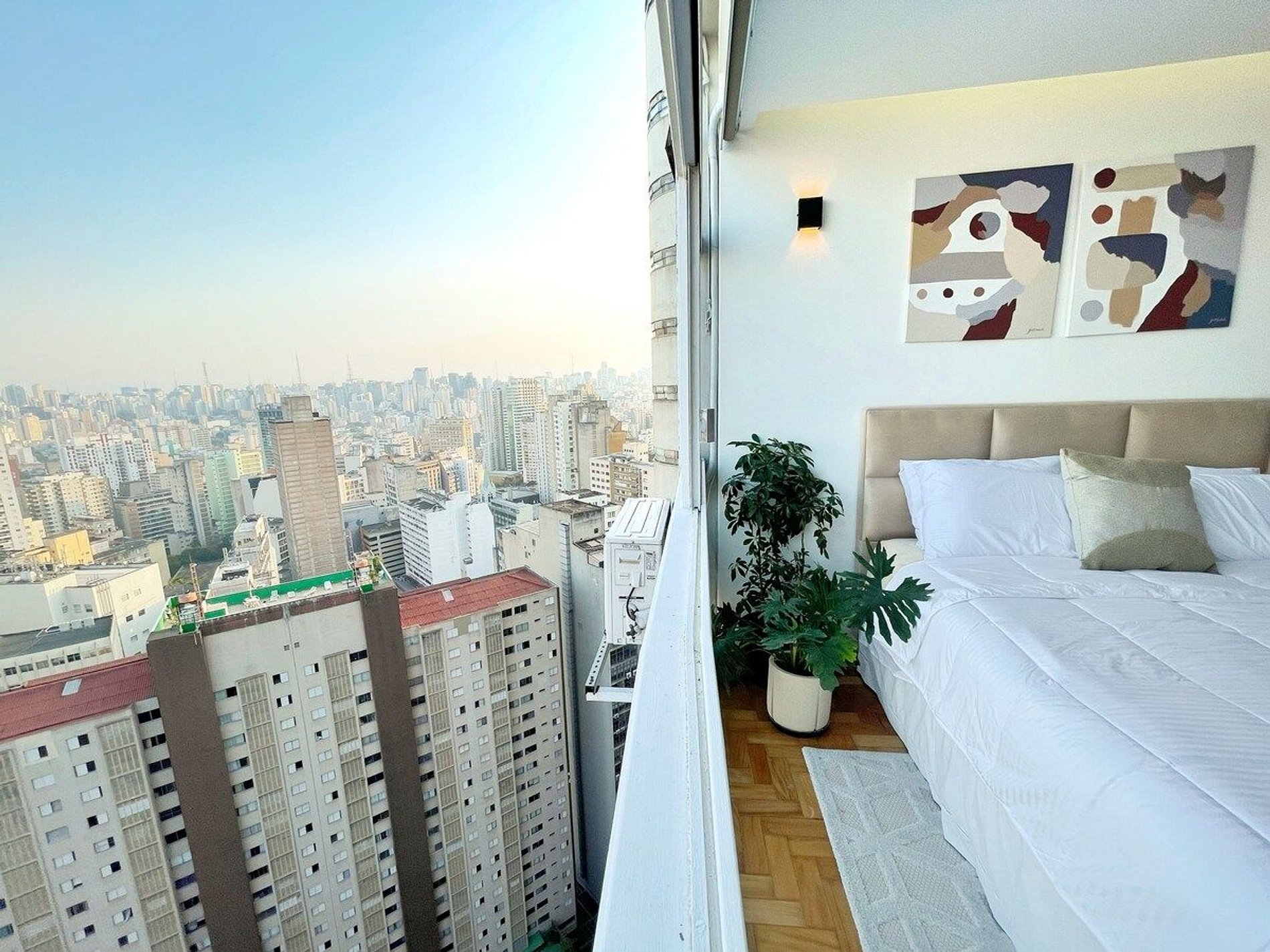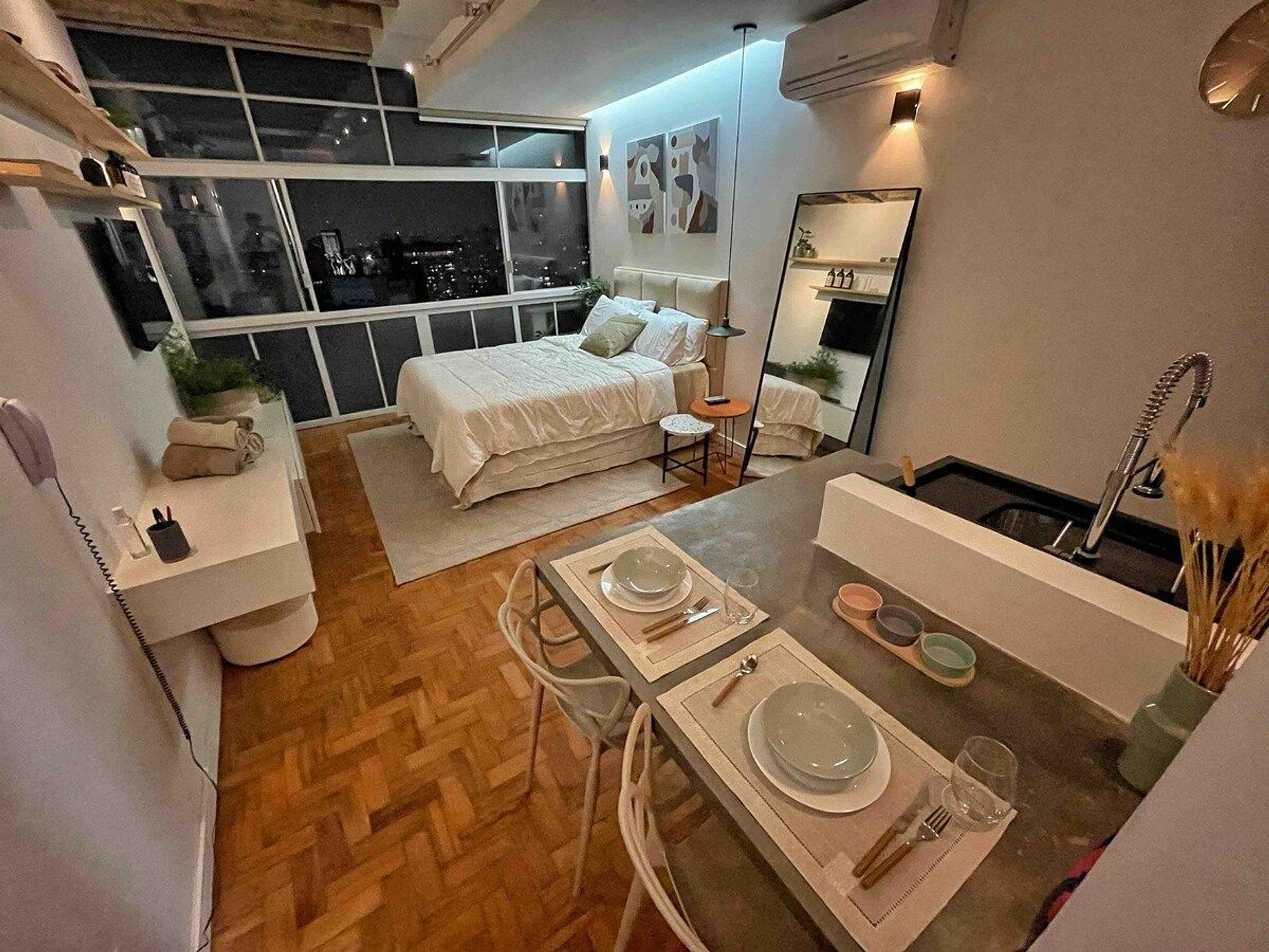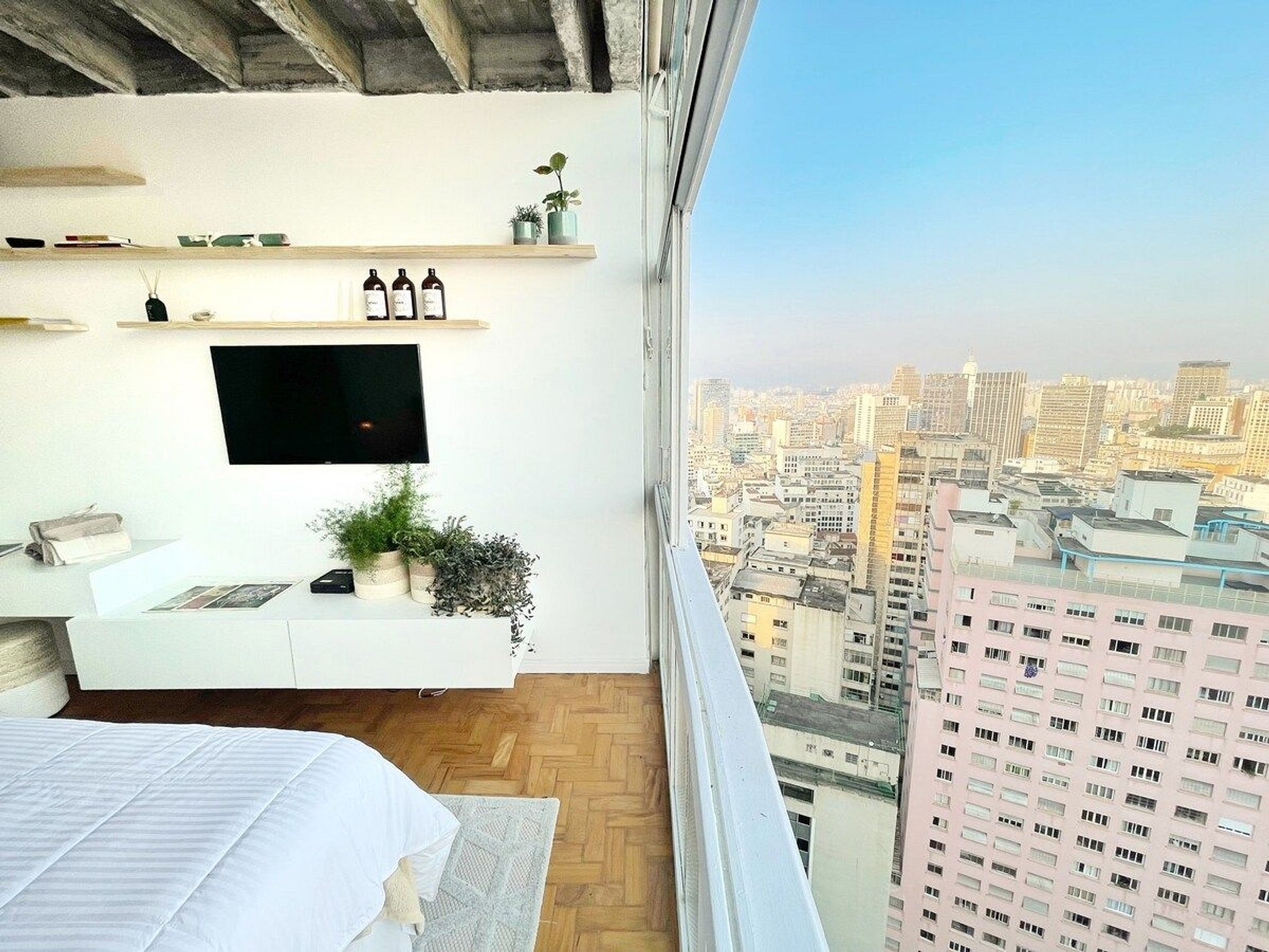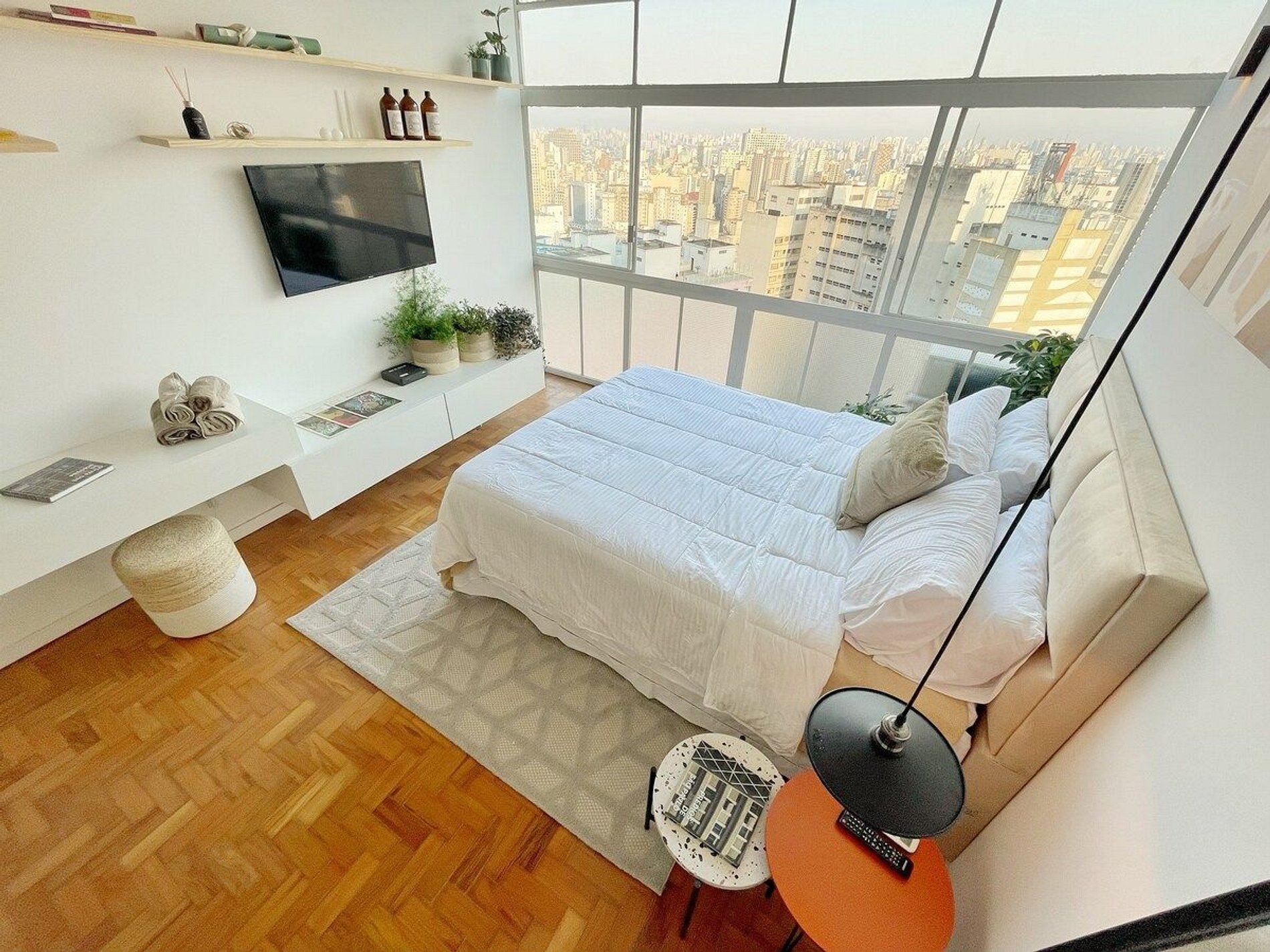 Projeto de @Zairagon Apartamento incrível no 27º andar do edifício mais famoso da cidade, o Copan. Apartamento com vista ampla e desimpedida, com uma cama Queen super confortável e SmarTV. Além disso, o apartamento conta com uma cozinha completa e mesa de jantar/trabalho, para quem quer curtir uma noite especial ou fazer seu Home Office em um lugar diferente. Para os dias mais quentes, o apartamento conta com Ar Condicionado, mas as janelas amplas já permitem uma ótima ventilação natural.