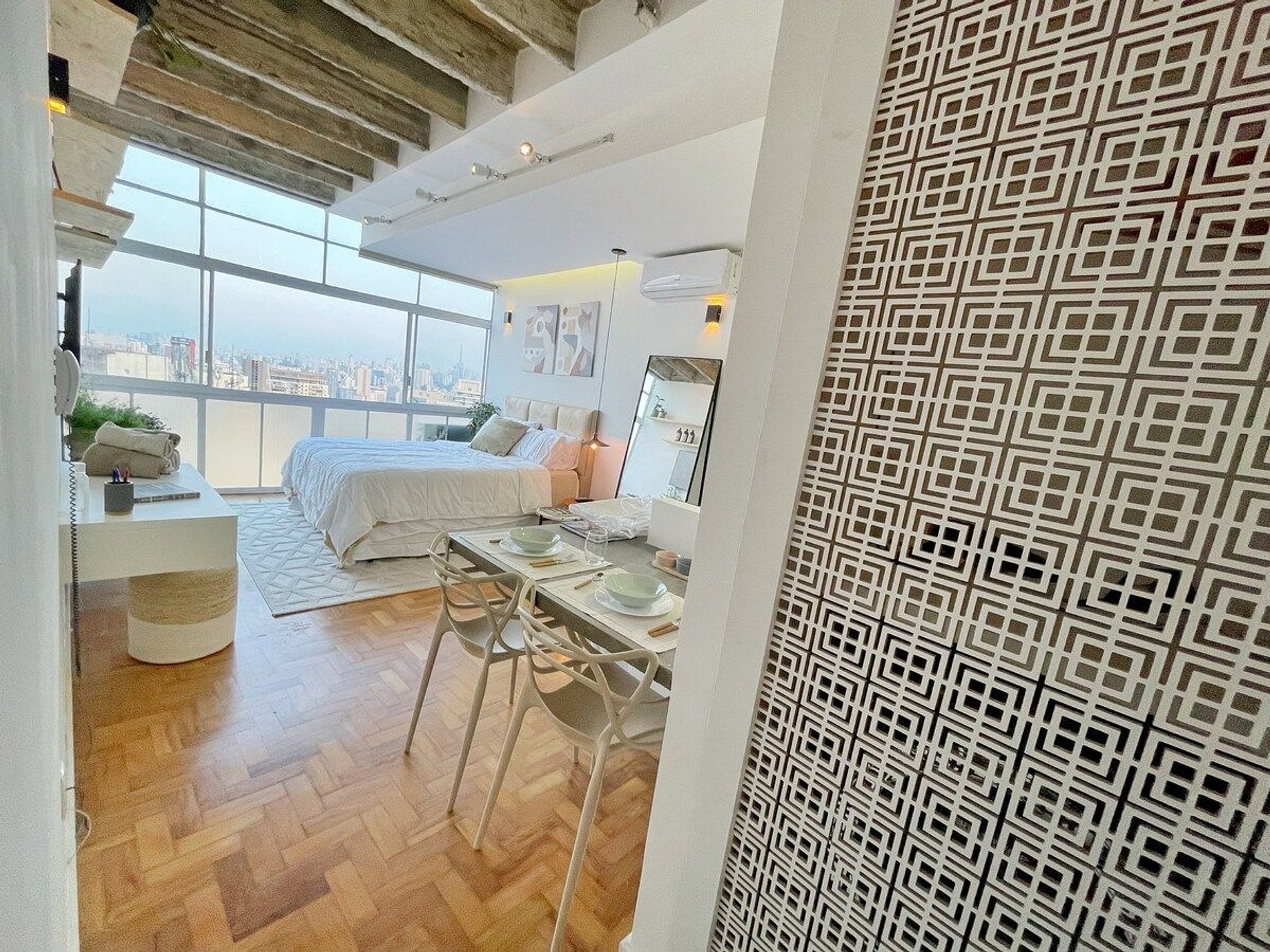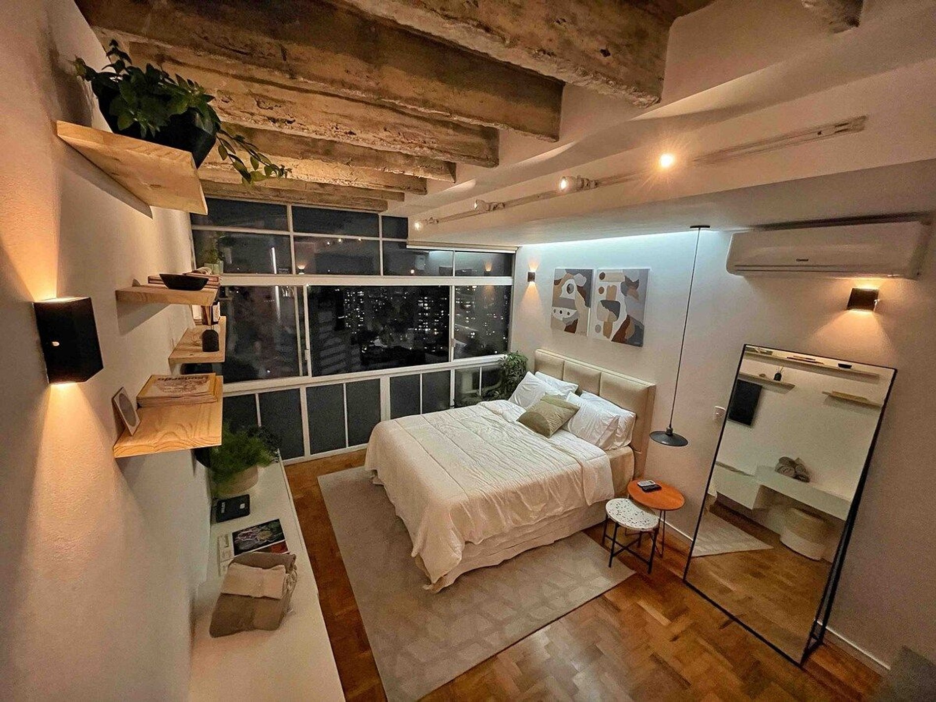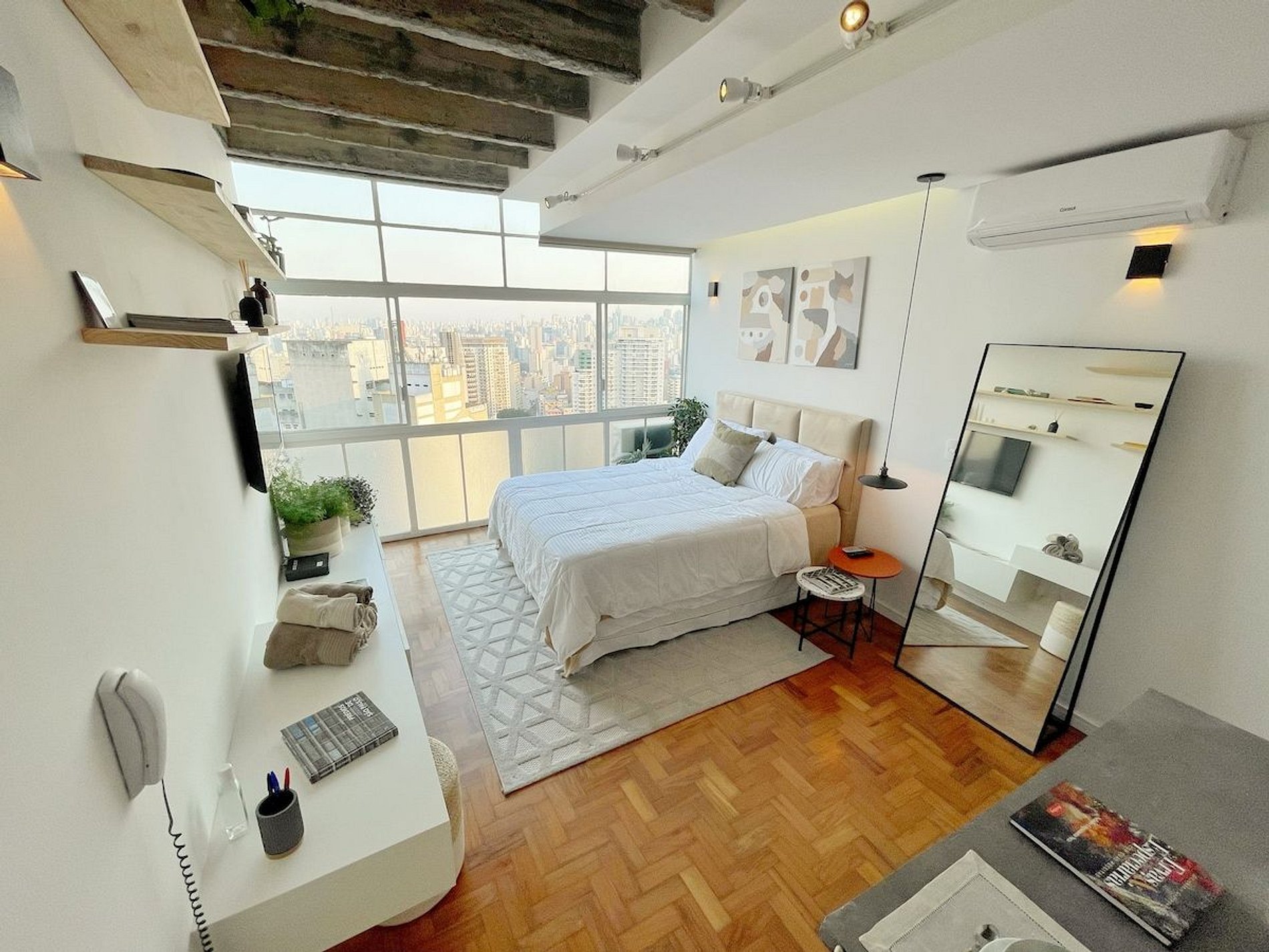 Projeto de @Zairagon Apartamento incrível no 27º andar do edifício mais famoso da cidade, o Copan. Apartamento com vista ampla e desimpedida, com uma cama Queen super confortável e SmarTV. Além disso, o apartamento conta com uma cozinha completa e mesa de jantar/trabalho, para quem quer curtir uma noite especial ou fazer seu Home Office em um lugar diferente. Para os dias mais quentes, o apartamento conta com Ar Condicionado, mas as janelas amplas já permitem uma ótima ventilação natural.