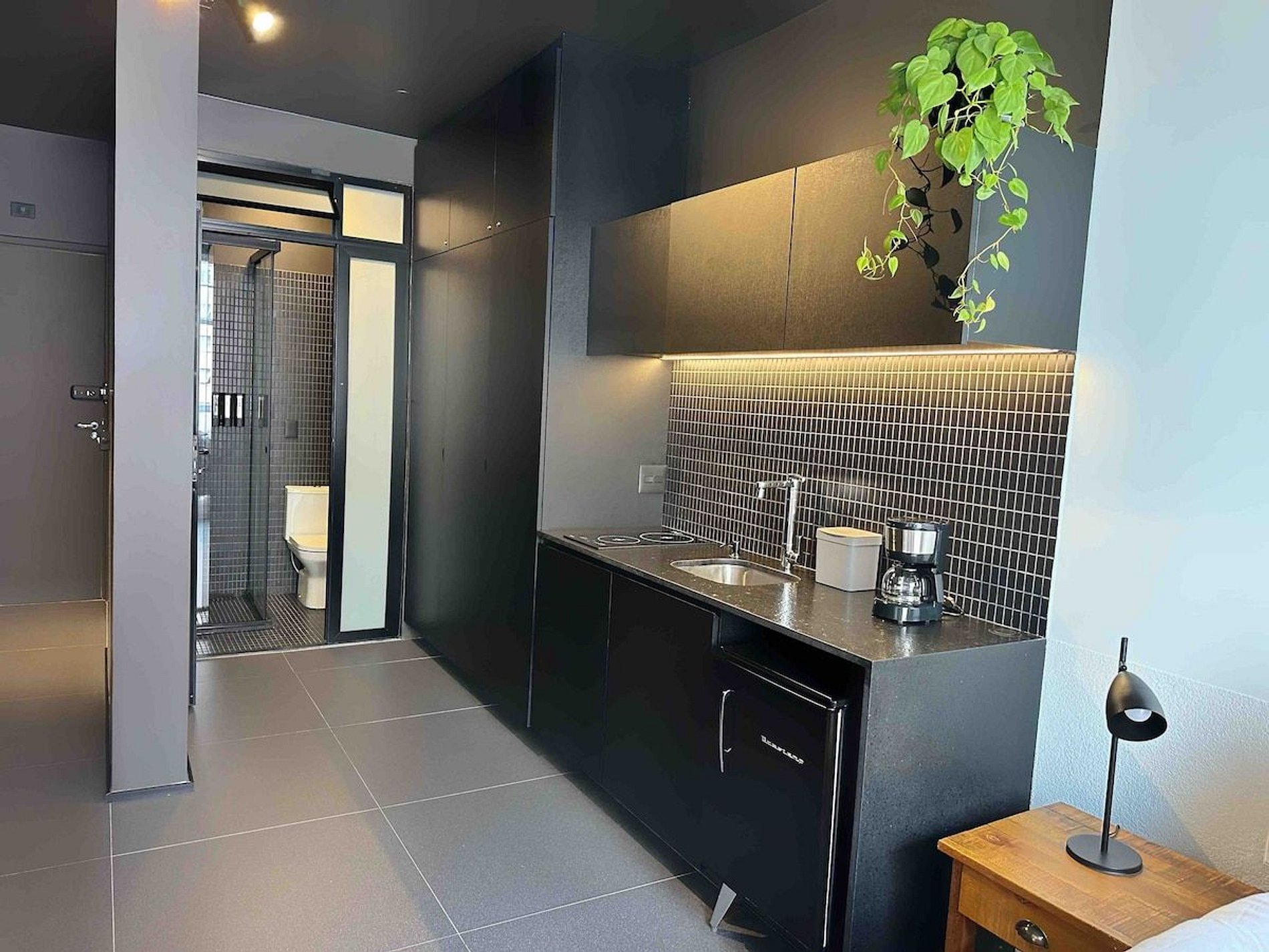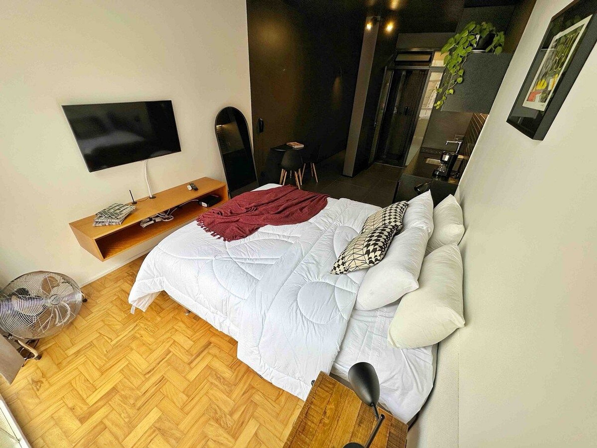 Um studio moderno e com bastante estilo no prédio mais famoso de São Paulo O projeto realça características originais do Copan, como as lajes nervuradas, mas traz elementos modernos, pensados para uma estadia confortável de curta ou longa duração Guarda roupa amplo. Cozinha completa, com fogão e microondas, além de todos os itens necessários pra suas refeições. Área de trabalho e internet fibra de alta velocidade, para viagens a negócios. Cama Queen confortável em andar tranquilo e silencioso