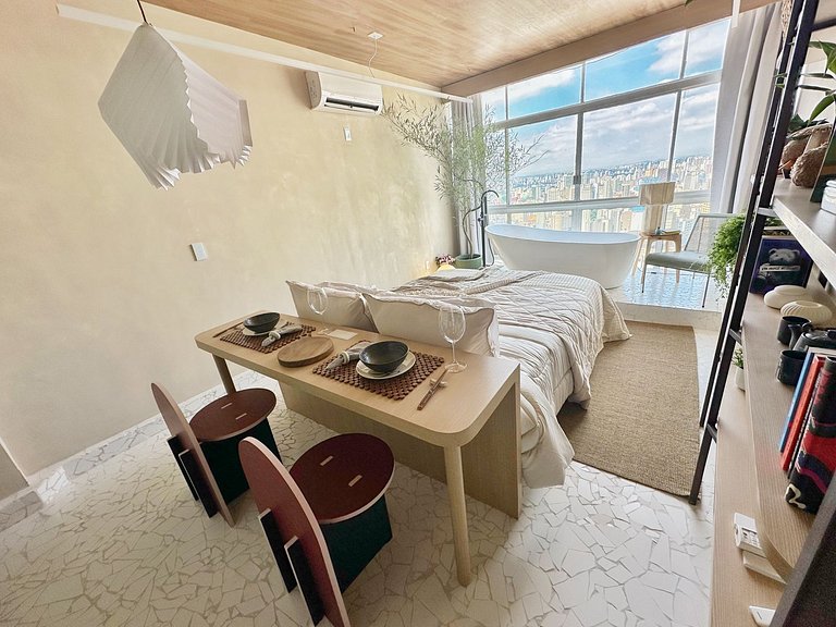 Por @yanainainteriores Este studio foi totalmente reformado em fevereiro de 2024. Trabalhamos para criar histórias de hospedagem. E a história desse Ape é sobre descansar. Um Studio projetado para hospedar livros e pessoas. A Proprietária, uma apaixonada por livros, deixou nele cerca de 50 obras que leu nos últimos 5 anos, todas com uma dedicatória especial que apresenta o livro aos hóspedes, além de alguns importantes trechos marcados. Telão de 100”, banheira e ar condicionado