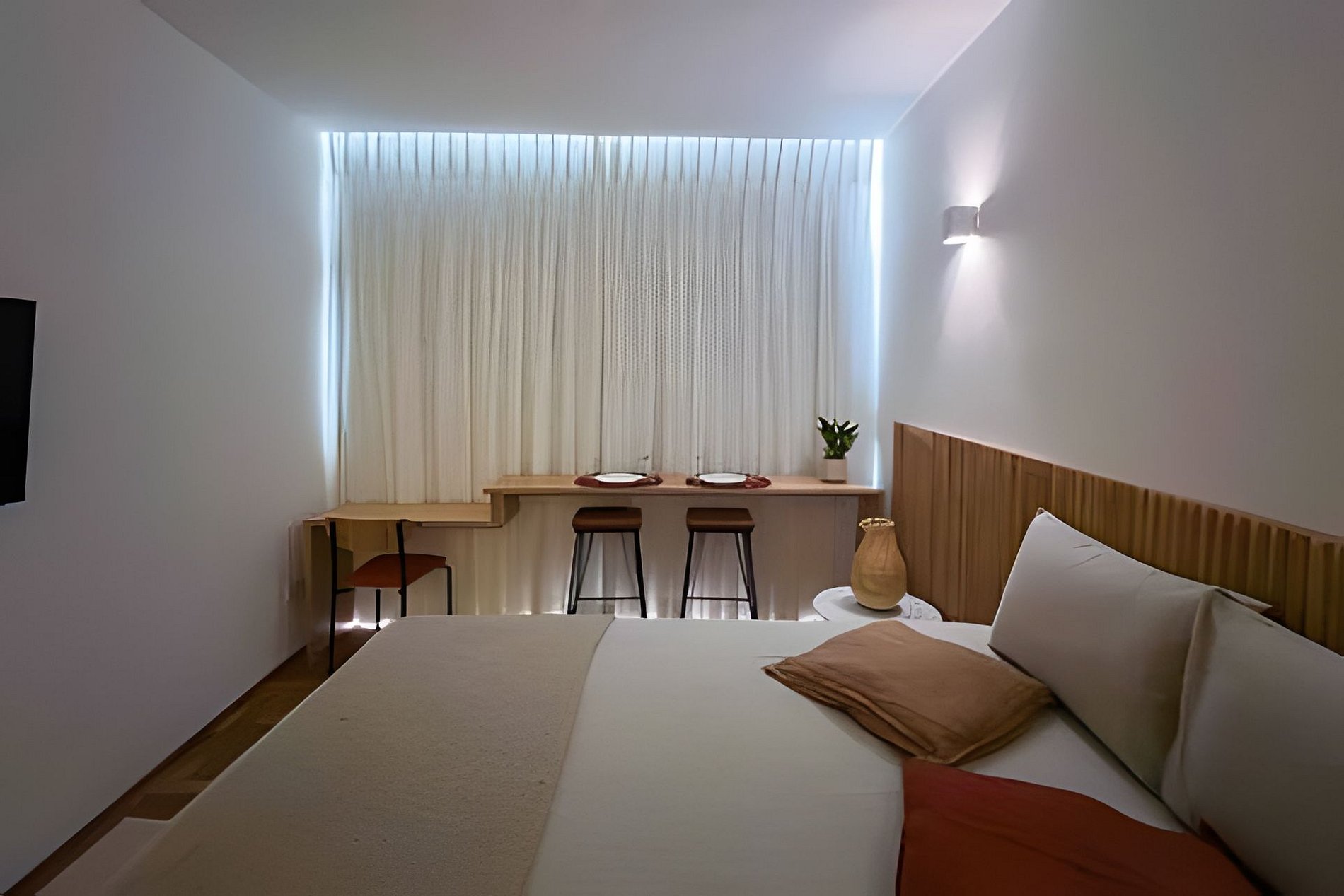 Studio moderno, aconchegante e muito bem iluminado no Copan. O ambiente conta com cama superconfortável, enxoval de qualidade e uma decoração clean com detalhes em madeira que deixam o espaço ainda mais acolhedor. A Smart TV instalada na parede otimiza o ambiente, e a bancada junto à janela, com banquetas, é perfeita para refeições ou trabalho. Um espaço prático, elegante e pensado para quem busca conforto e conveniência no centro de São Paulo.