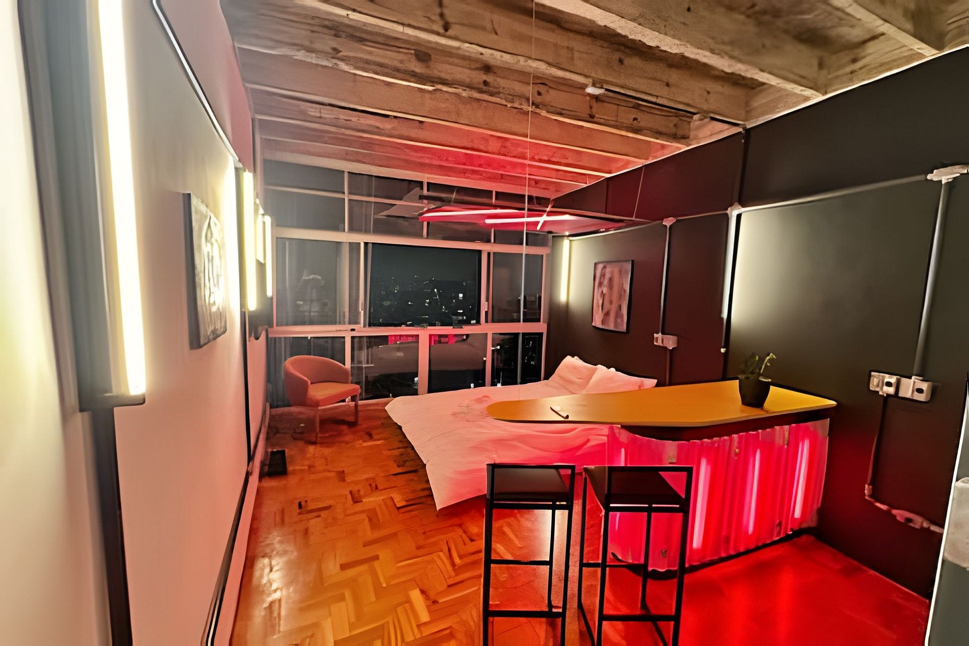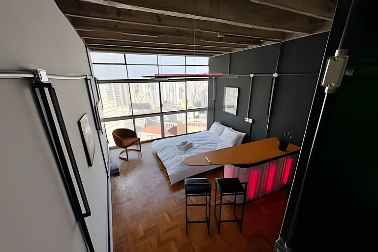 Studio recém reformado no Edifício Copan. Vista incrível do 26º andar para o Nascer do Sol. A cama baixa, junto com os vidros totalmente transparentes, vão fazer você se sentir dormindo nas nuvens. Decoração moderna e com elementos de arte contemporânea. Pequeno closet para deixar suas coisas organizadas. Internet de alta velocidade para seu home office ou smarttv.