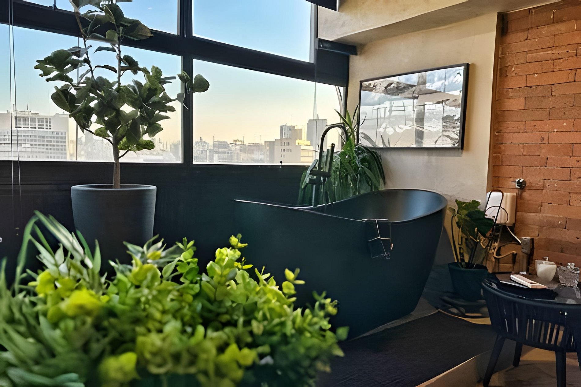 Imagine relaxar em uma banheira ao lado da janela enquanto a cidade pulsa abaixo de você. O cenário perfeito para um vinho ao pôr do sol ou um café com vista panorâmica ao amanhecer.
