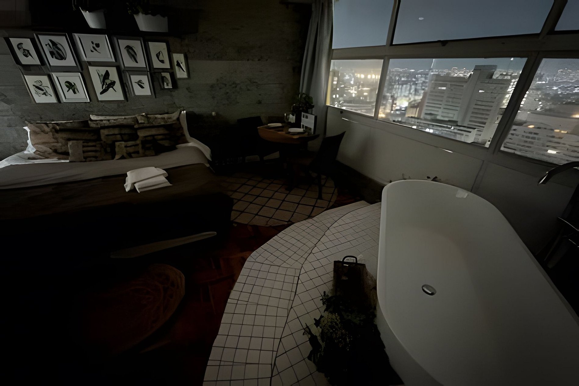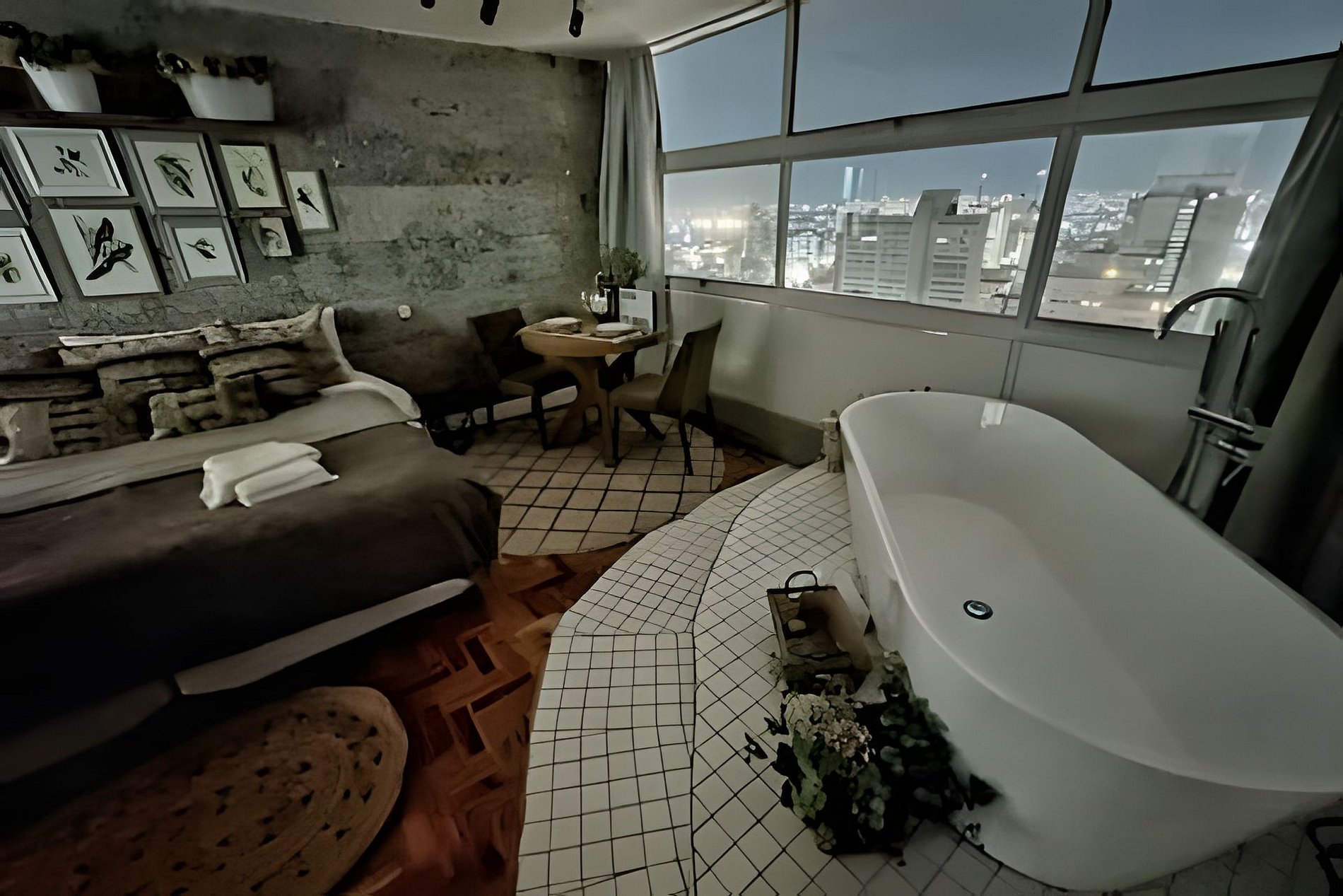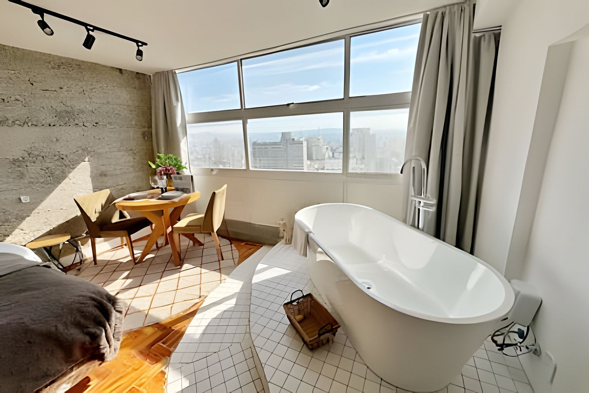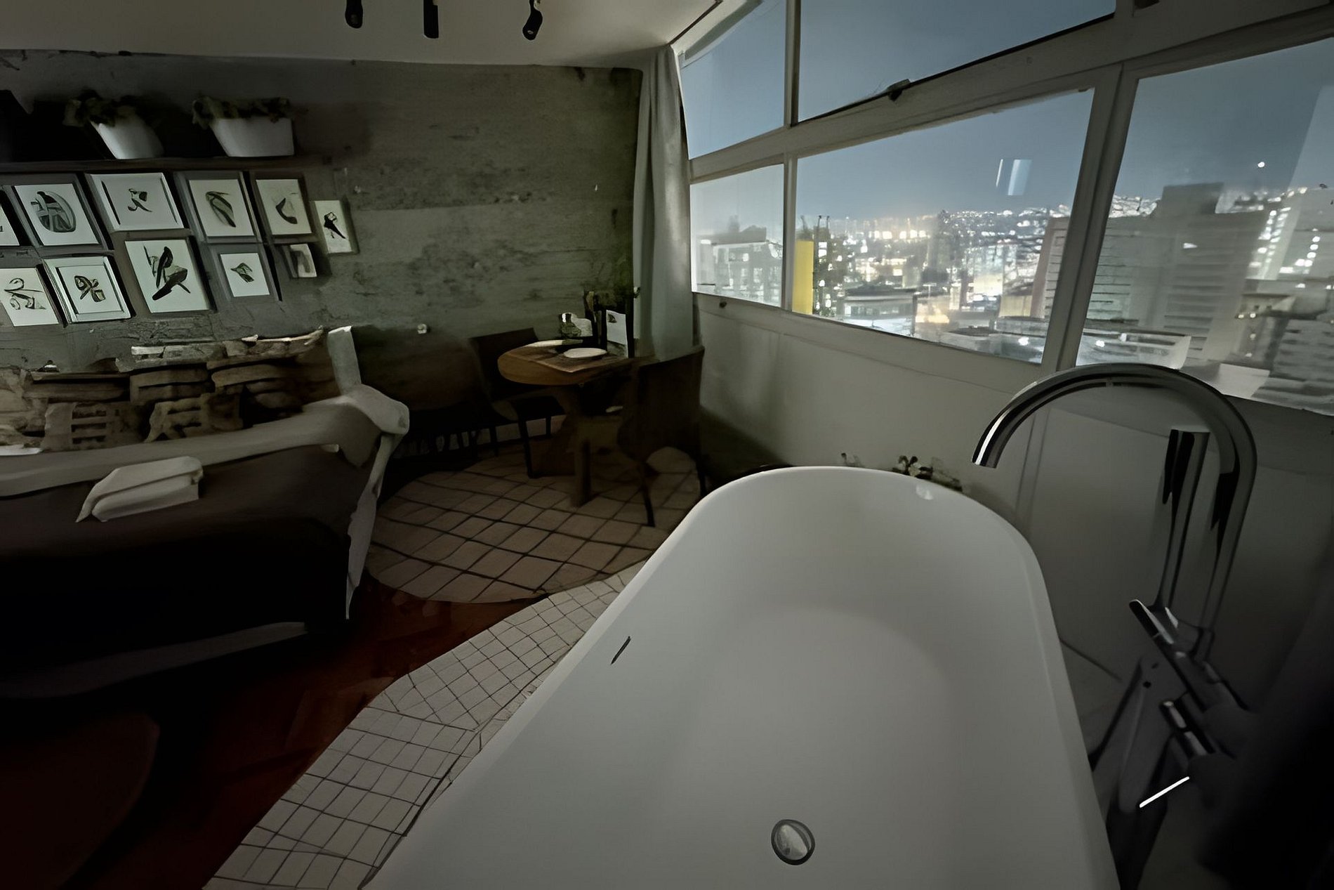 Imagine relaxar em uma banheira ao lado da janela enquanto a cidade pulsa abaixo de você. O cenário perfeito para um vinho ao pôr do sol ou um café com vista panorâmica ao amanhecer.
