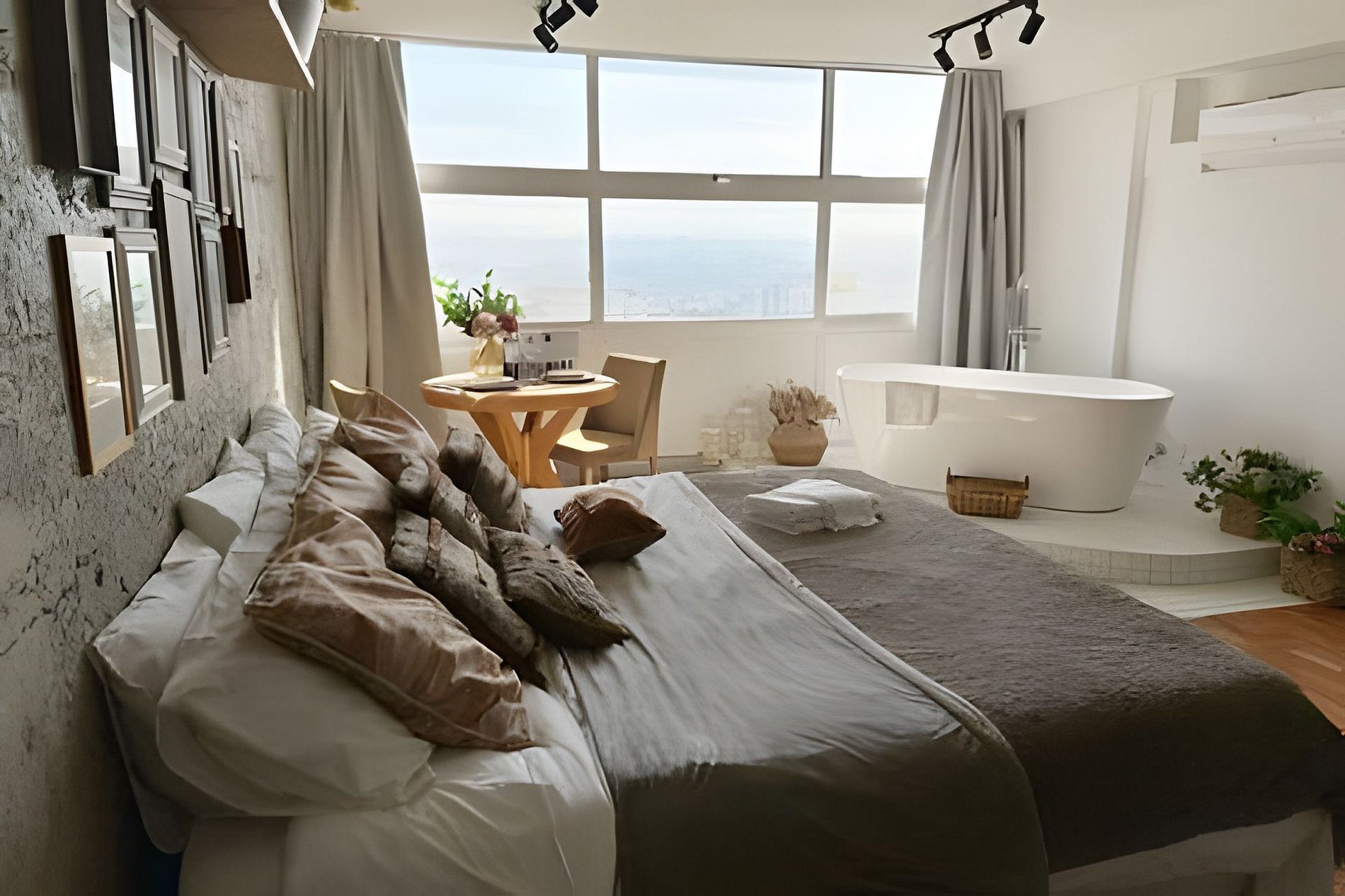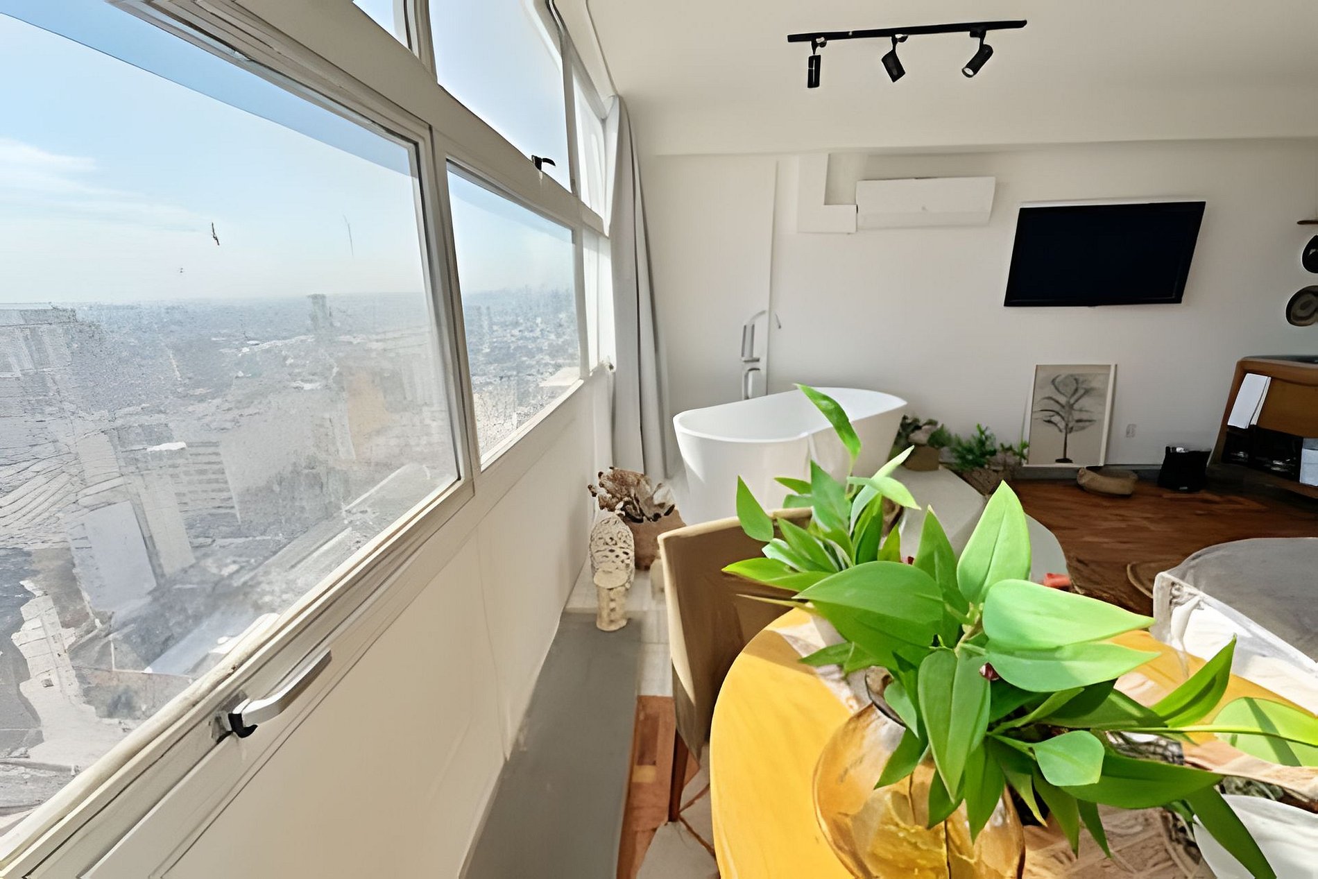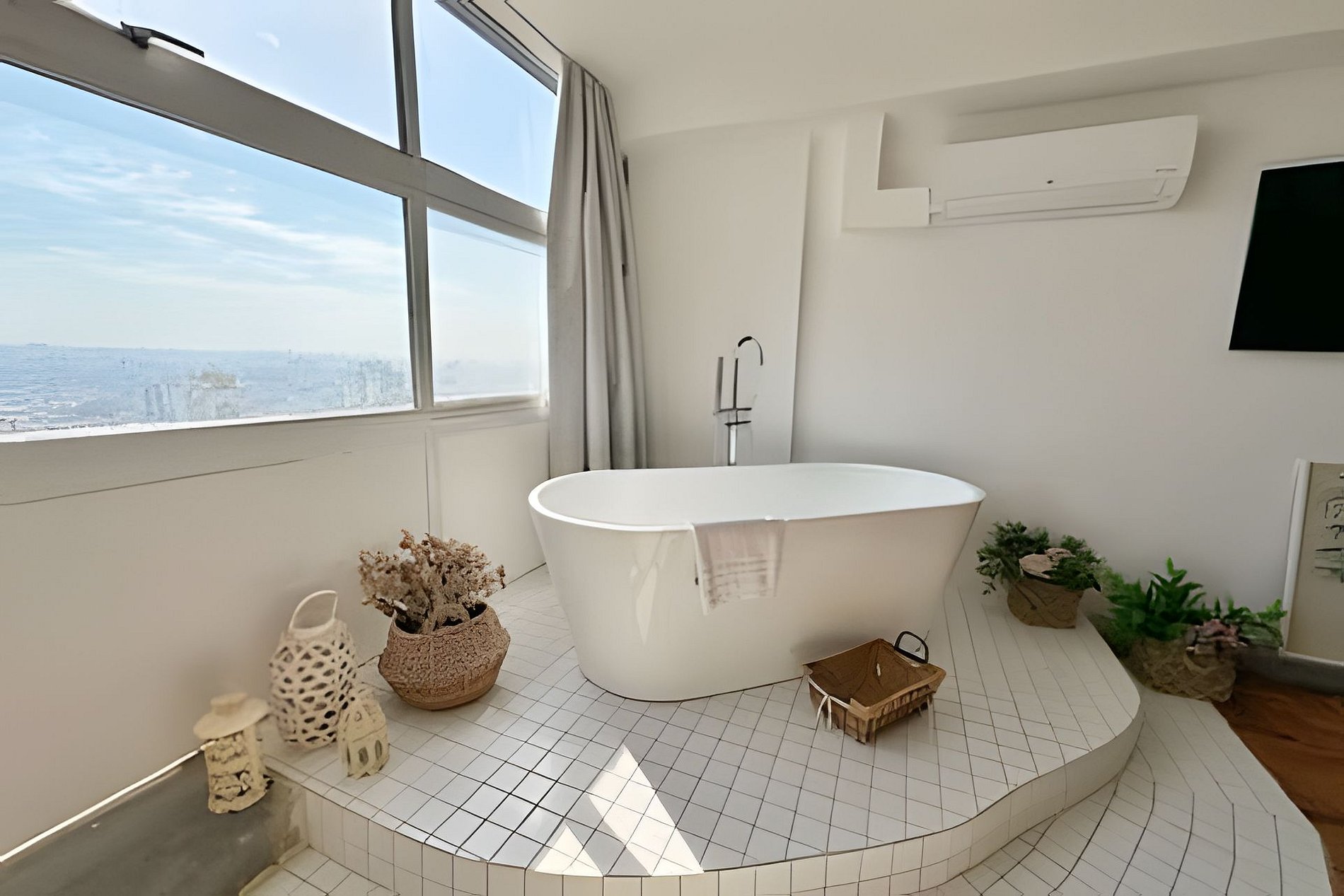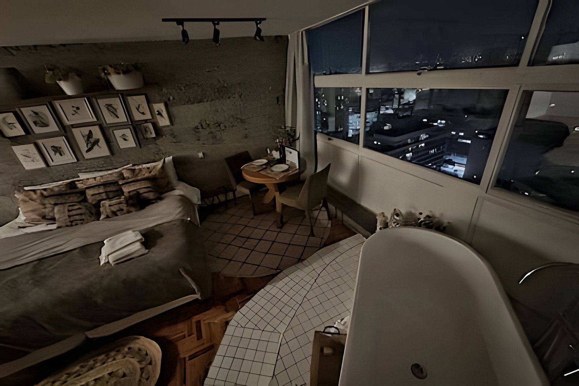 Imagine relaxar em uma banheira ao lado da janela enquanto a cidade pulsa abaixo de você. O cenário perfeito para um vinho ao pôr do sol ou um café com vista panorâmica ao amanhecer.