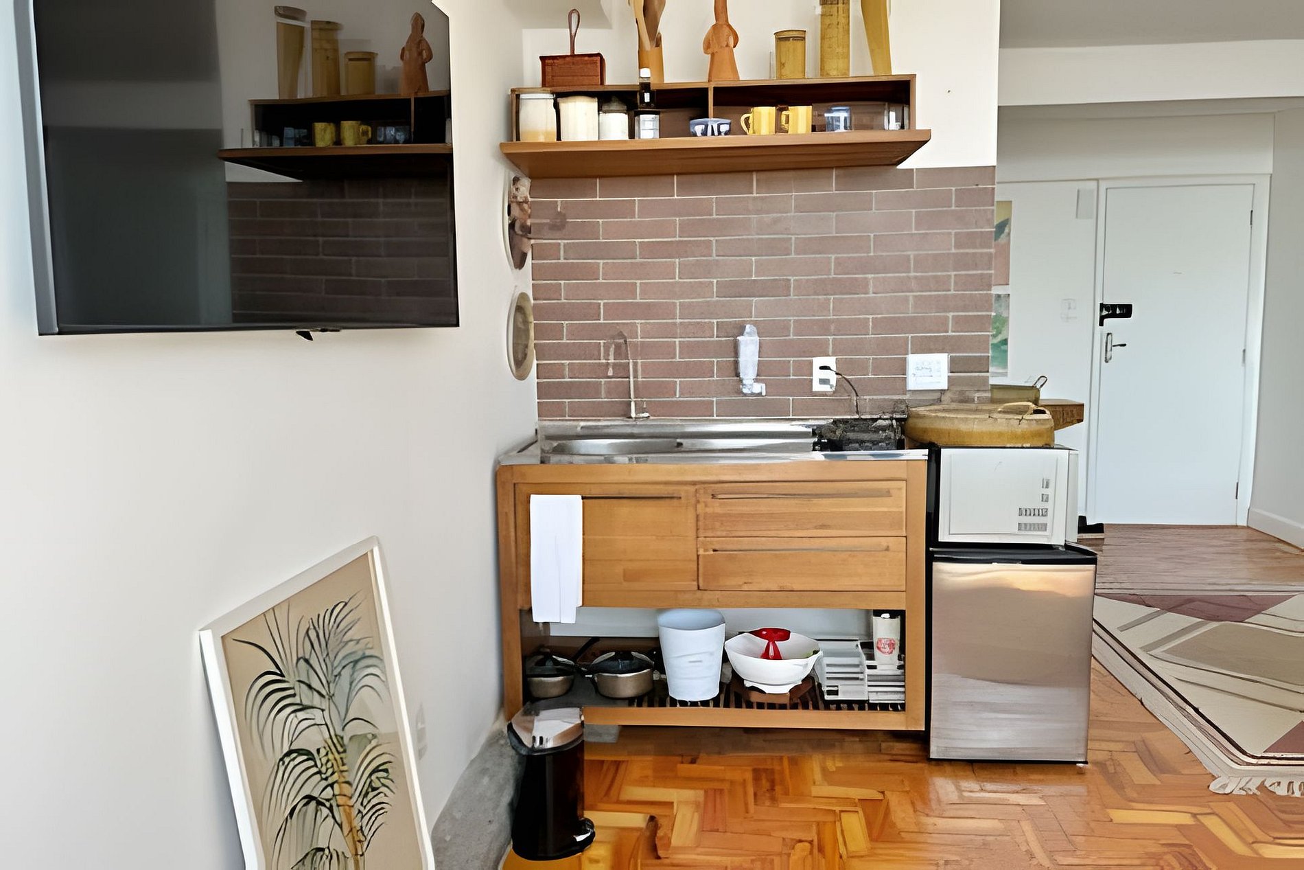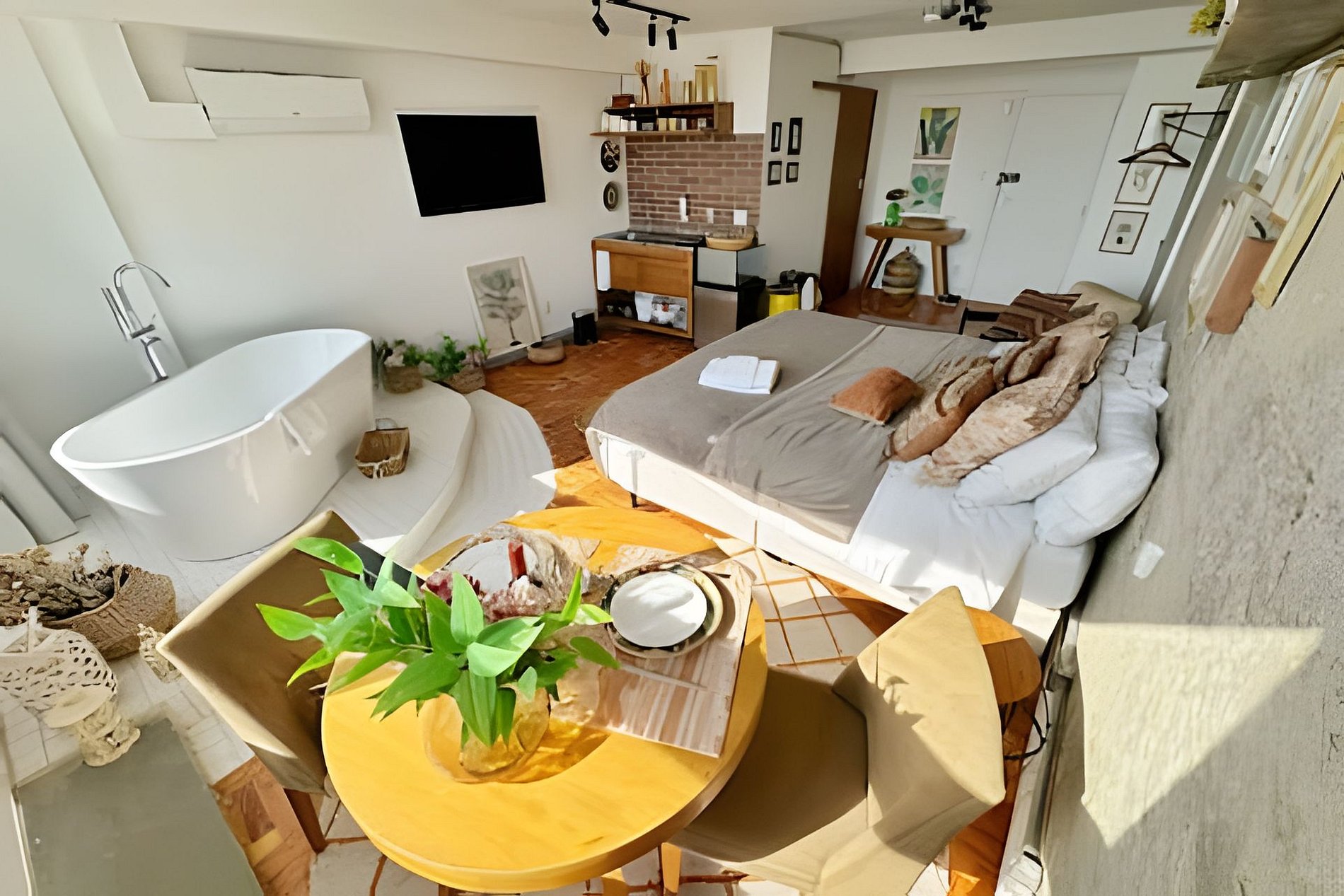 Studio espaçoso, design contemporâneo, Wi‑Fi rápido, cooktop, frigobar e aquela banheira charmosa para coroar sua experiência. Tudo pensado para você se sentir em casa com um toque de luxo